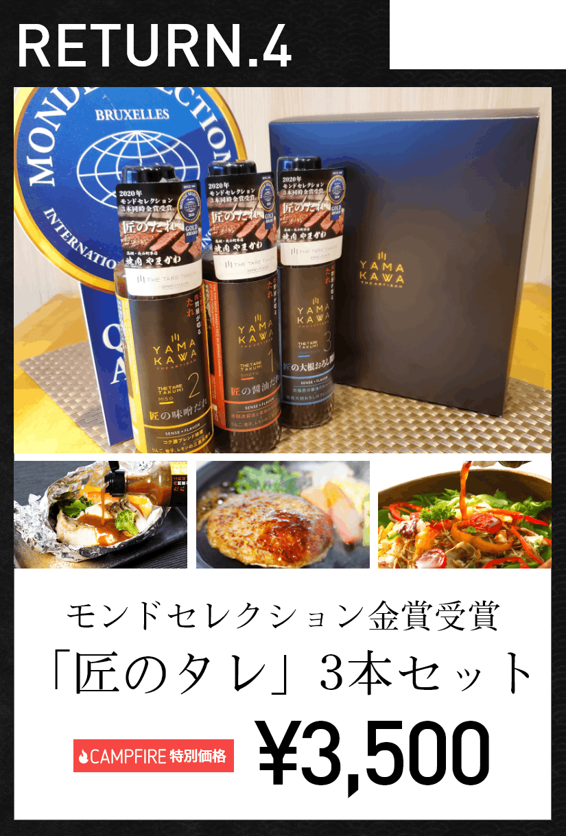 ※匠のたれ3本セットのみのリターンもご用意しております。この機会に、是非ご支援のほどよろしくお願いいたします!