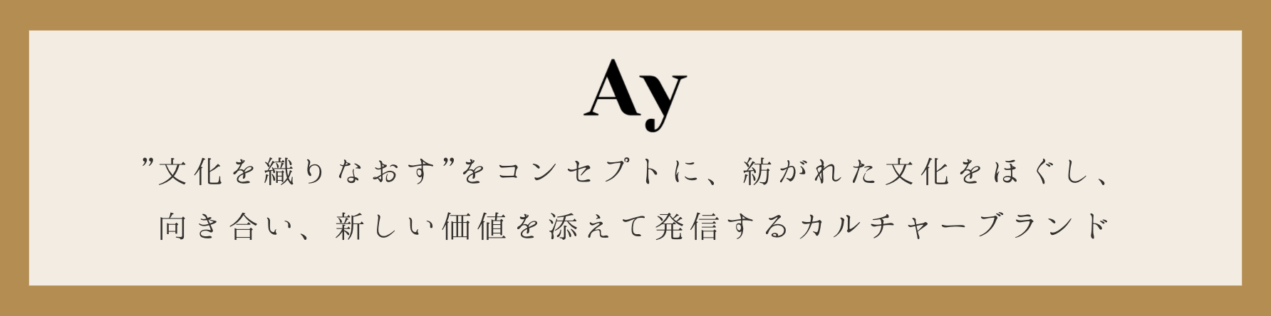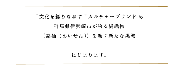Ay(アイ)は、群馬県伊勢崎市から、地域文化の豊かさを発信するとともに、産業を発展させてきた絹織物である銘仙(めいせん)に革新を起こそうとしています。