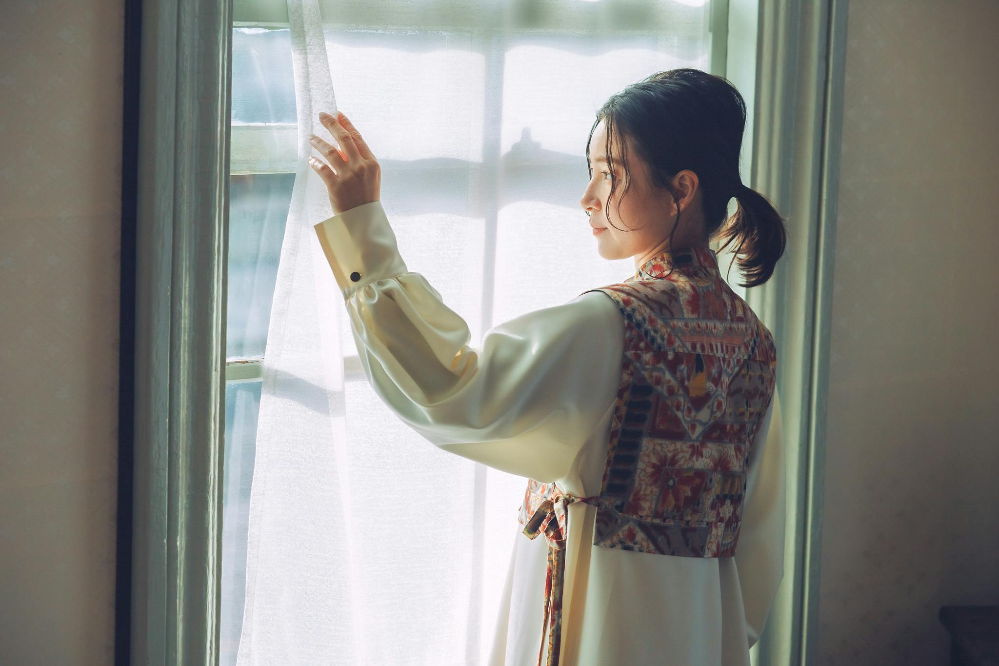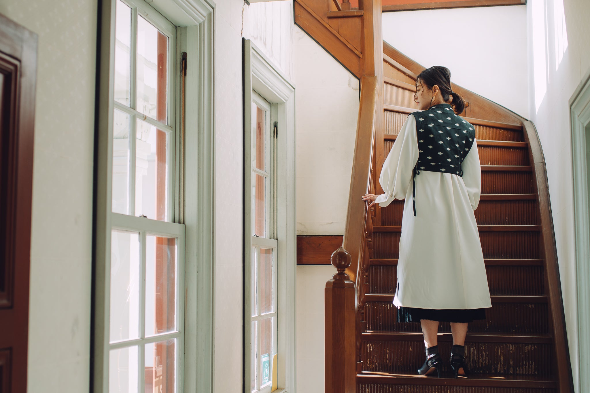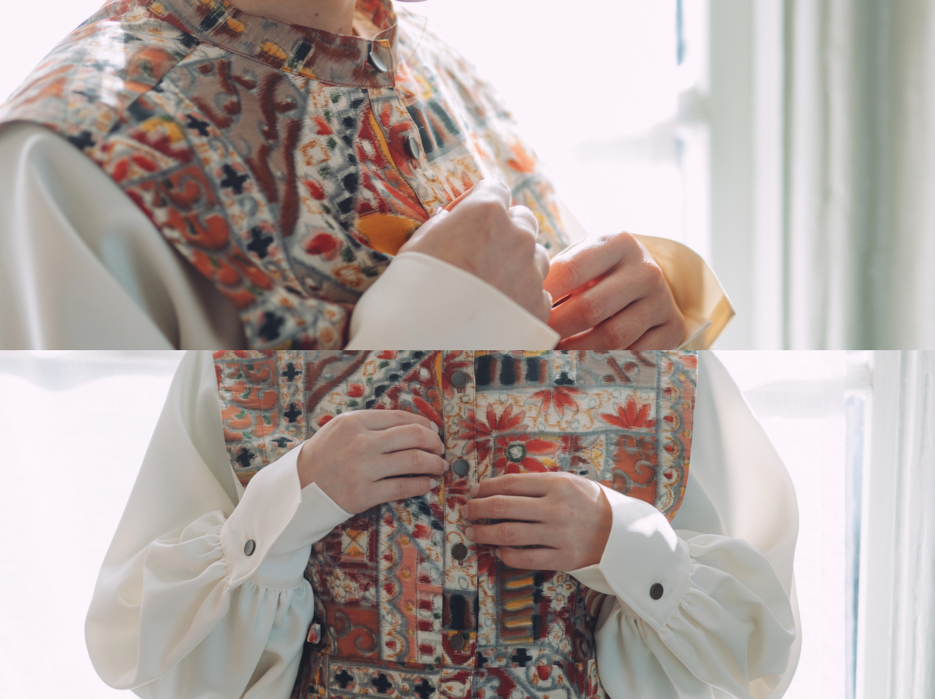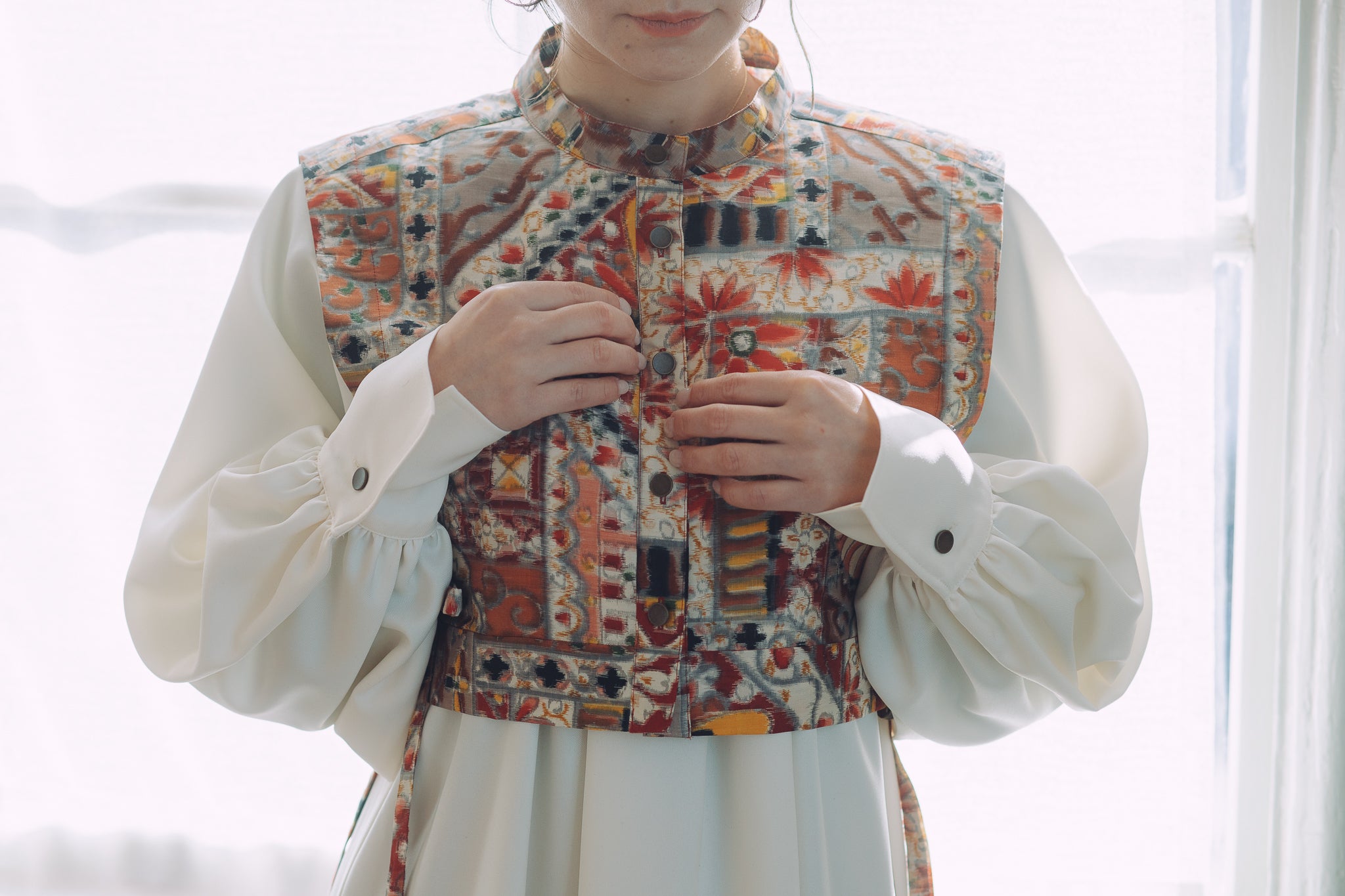 銘仙を使用したシャツベストとアイボリーのスモックワンピース。ワンピースのフワッとした腕がエレガント、そして両サイド丈のスリットがちょうどよく全体に動きを与えます。