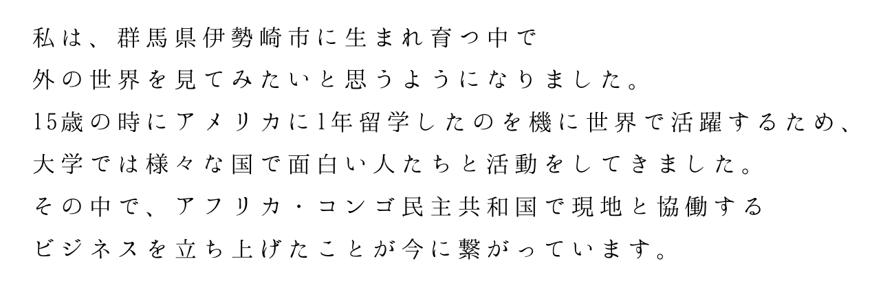 「地域から世界で活躍したい」そんな想いがあり中学受験を経て、日本で2番目にできた公立の中等教育学校出身、アメリカでの長期留学、地方から慶應義塾大学(SFC)への進学、アフリカ・コンゴ民主共和国への2度の渡航、コンゴとの教育・社会における研究、国際的なビジネス、ブランド経営、地方で働くことについてなど、様々な視点からお話ができます。この機会に、ぜひお話ししましょう!