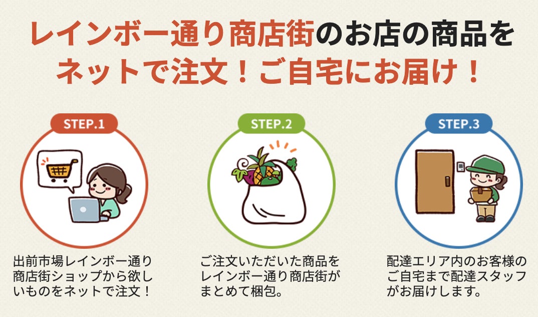 飲食店だけでなく、八百屋や精肉店、さらには生活用品店にいたるまでが勢揃い!今やレインボー通り商店街を中心に、複数の商店街にまでまたがった様々な専門店が出前市場に参加してます。