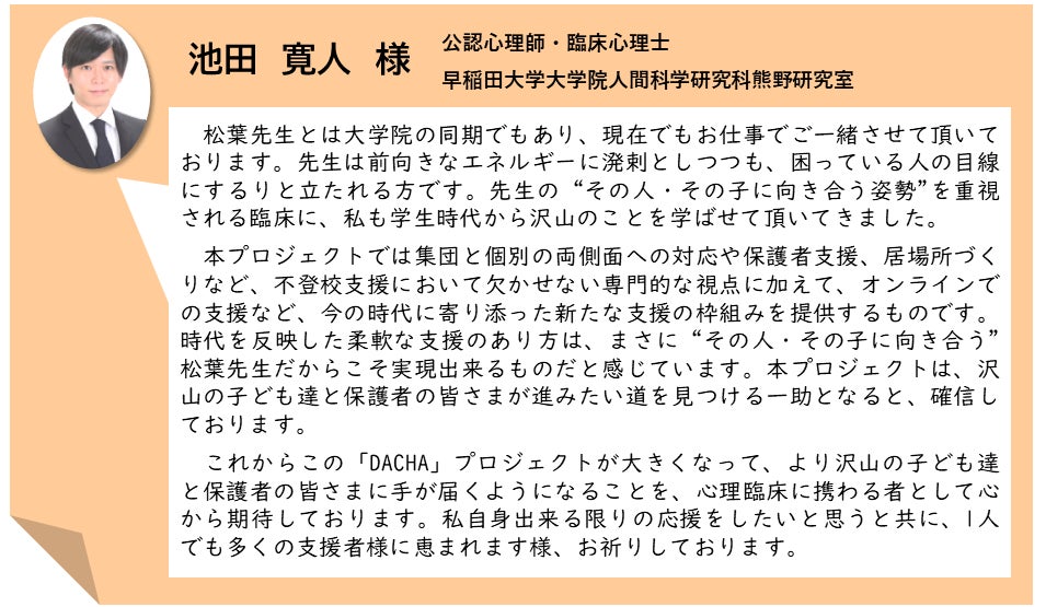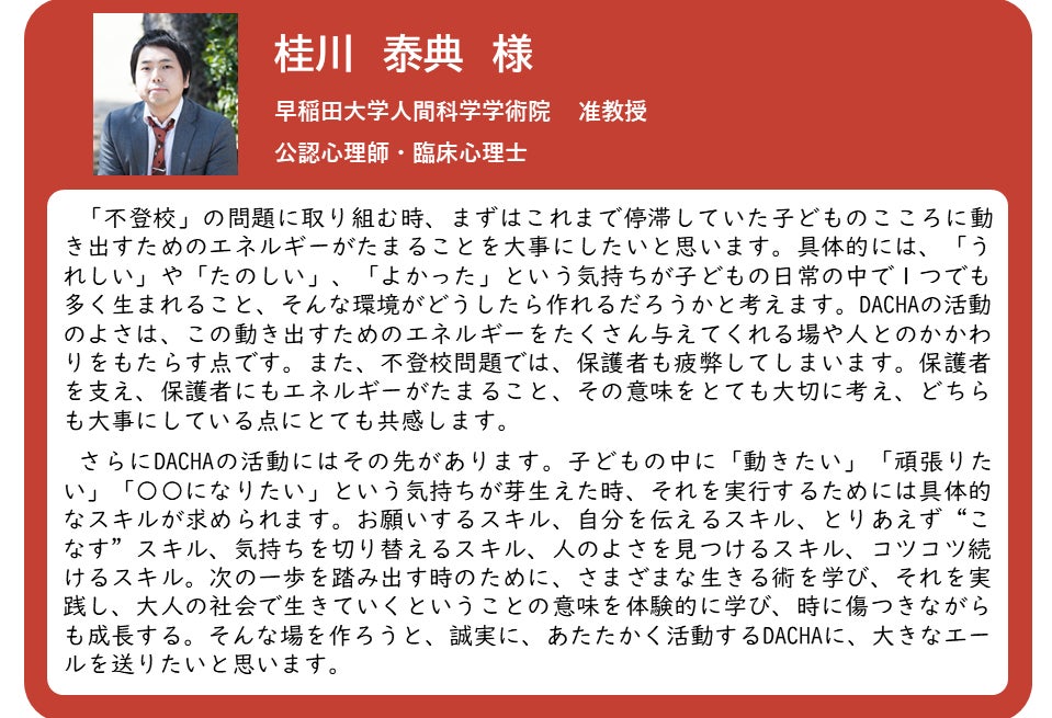 現在は『Office DACHA(オフィス・ダーチャ)』という個人事務所にて,不登校のお子さまに個別支援を展開しております。新事業として,フリースクールを中心とした不登校の中高生に対する居場所支援を都内にて提供していくために,2021年4月以降に『DACHA LABO』を法人設立する予定です。