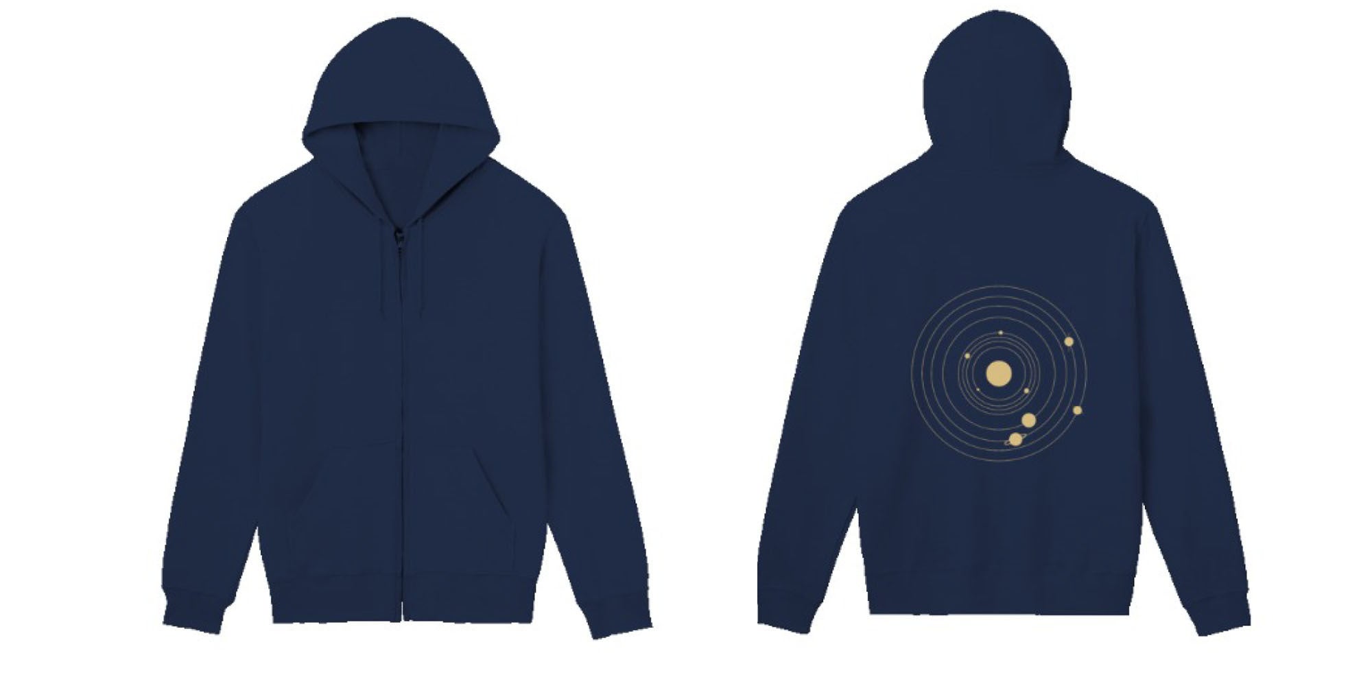 背中に太陽系を模したシンプルなデザインのパーカー(ネイビー)です。太陽系の位置はクラウドファンディングを行った2021年3月を表しています!サイズ(S〜XL)をお選びください。
