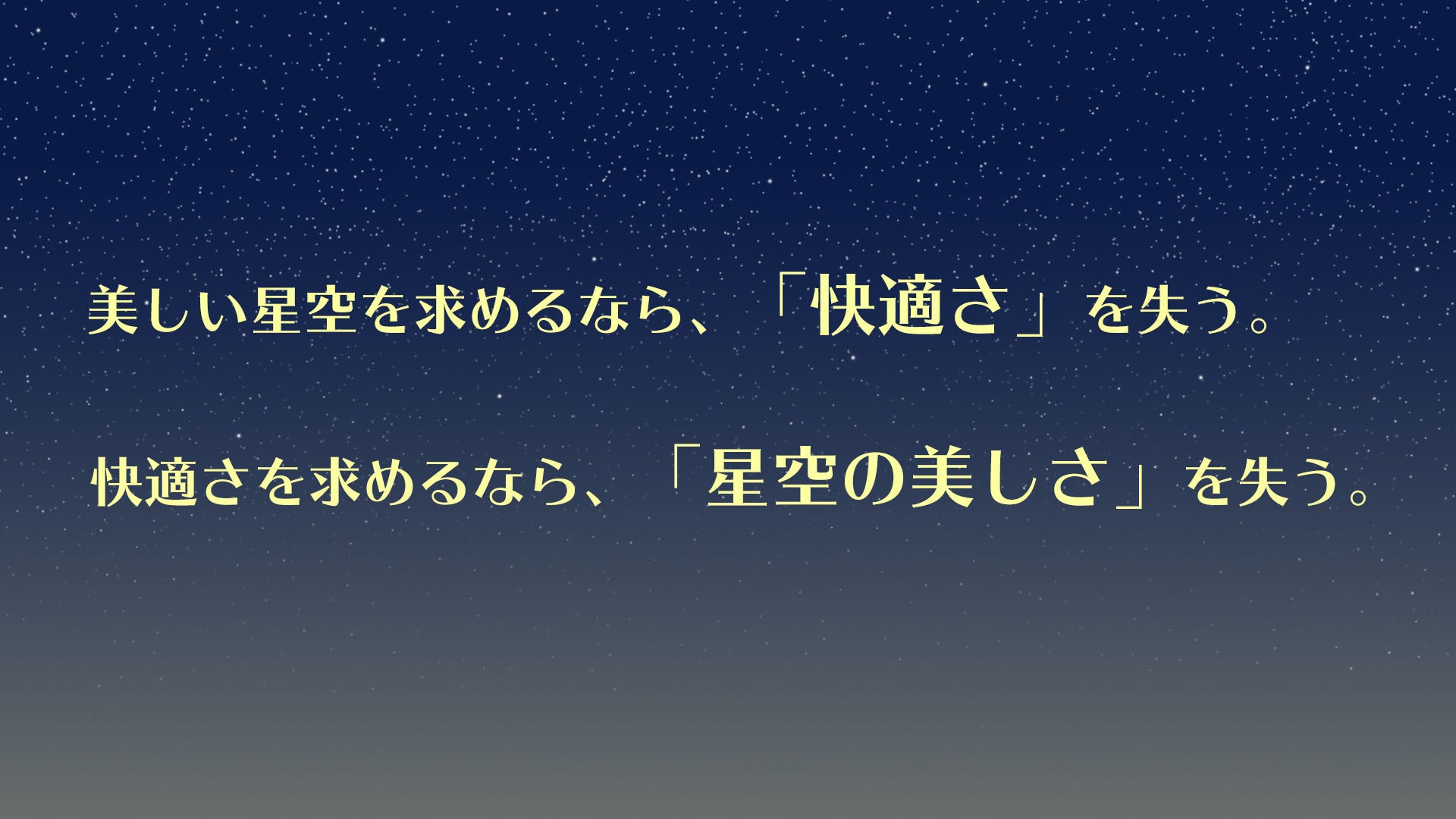 「星空の美しさ」と「環境の快適さ」はほとんど両立できておらず、星に配慮された場所というのは非常に少ないのが現状です。