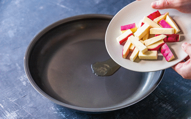 フライパン表面は、特殊な製法(アルマイト加工)でフッ素樹脂をコーティングしており表面ツルツルで滑りやすい。
