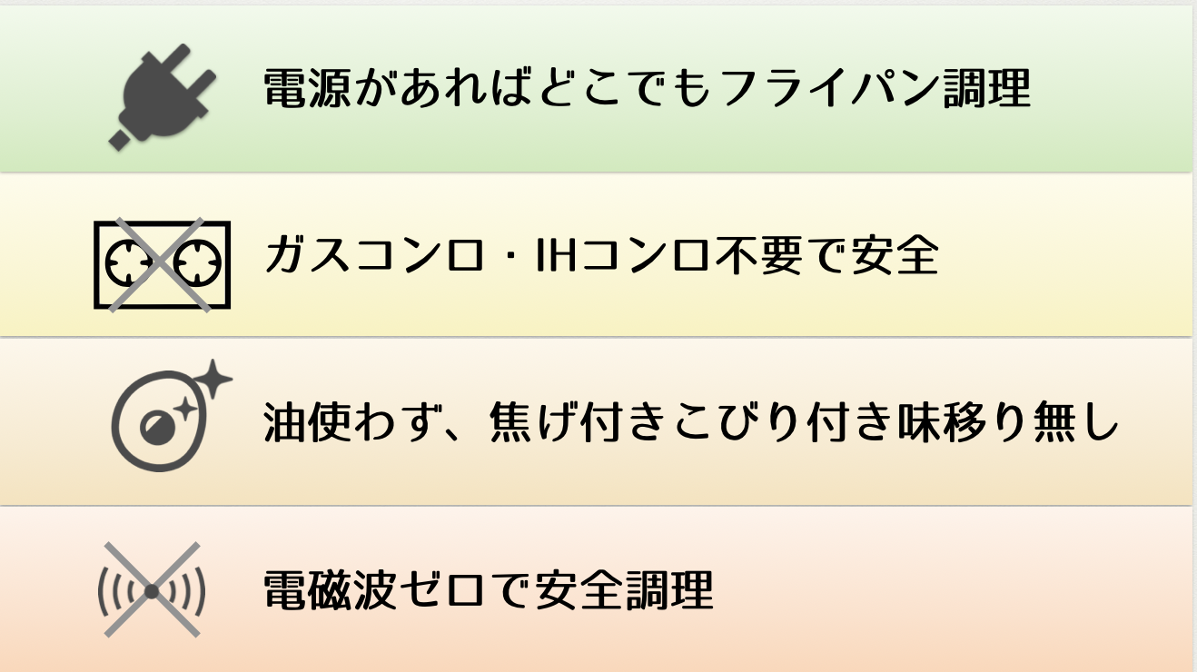 また、フライパン全面にヒーターを配置出来ないため焼きムラで出来ます。
