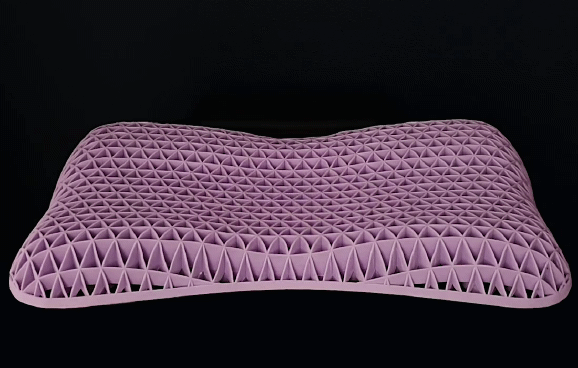 Fit Nek のTPEコアフォームは上面1,038個、下面280個の三角柱で形成されています。2種類の大きさの三角柱を上下に配置し、さらに上下左右で微妙に高さのの異なる滑らかな曲線を描くことにより、他にはない頭の重さの【分散・吸収・サポート】を実現しました。