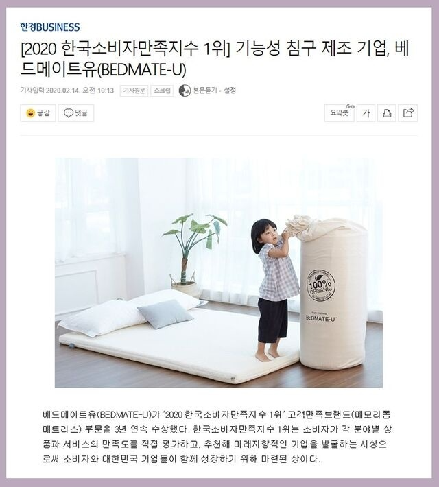 韓国の機能性寝具の製造企業として 3年連続で1位を獲得