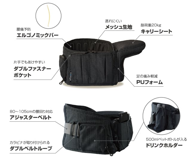 「3WAYFIT」は、力のない女性が、骨盤で子供や重い荷物を運ぶ姿から、荷物を載せるためのキャリーシートを開発しました。キャリーシートの耐荷重は20kg。ビールの大瓶1ダースを載せることができます。