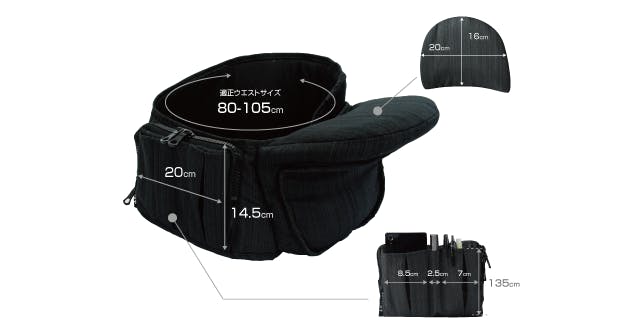 60cmのアジャスターベルトで腰回りのサイズが調整でき、80-105cmまで調整ができます。