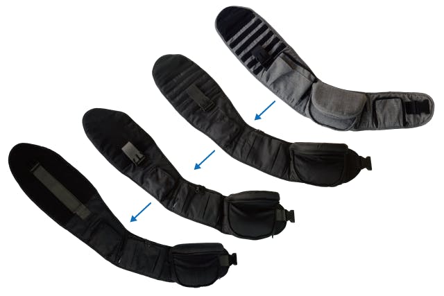 試作段階では、「見た目をよりよくする生地の選定」、「ウェストバッグの中に何を入れているのか」、「サポーターの機能を高めるバーの配置」など何度も修正を行い、「外に見せても恥ずかしくない、腰痛サポーター付きウェストバッグ」になりました。