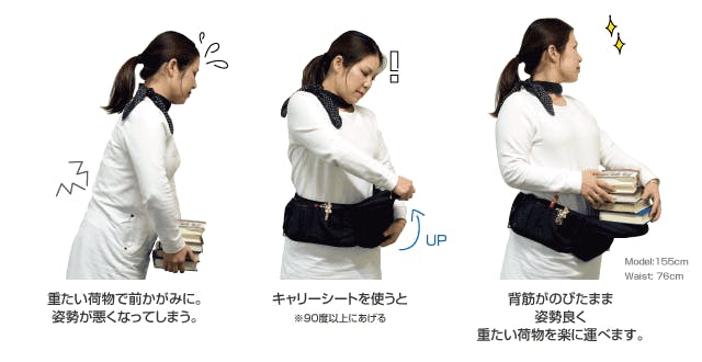 「3WAYFIT」は、腰痛を予防する「腰サポーター」。両手が自由に使える「ウェストバック」。20kgまでの重さの荷物を載せることができる「キャリーシート」の機能が1つになった、全く新しいデザインの製品です。