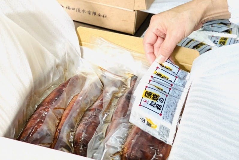 ・原材料:うなぎ(鹿児島県)、しょうゆ、砂糖混合異性化液糖、発酵調味料、水あめ、砂糖、うなぎエキス/酒精、増粘剤(加工澱粉、増粘多糖類)、調味料(アミノ酸)、着色料(カラメル、アナトー)、(一部に小麦・大豆を含む)