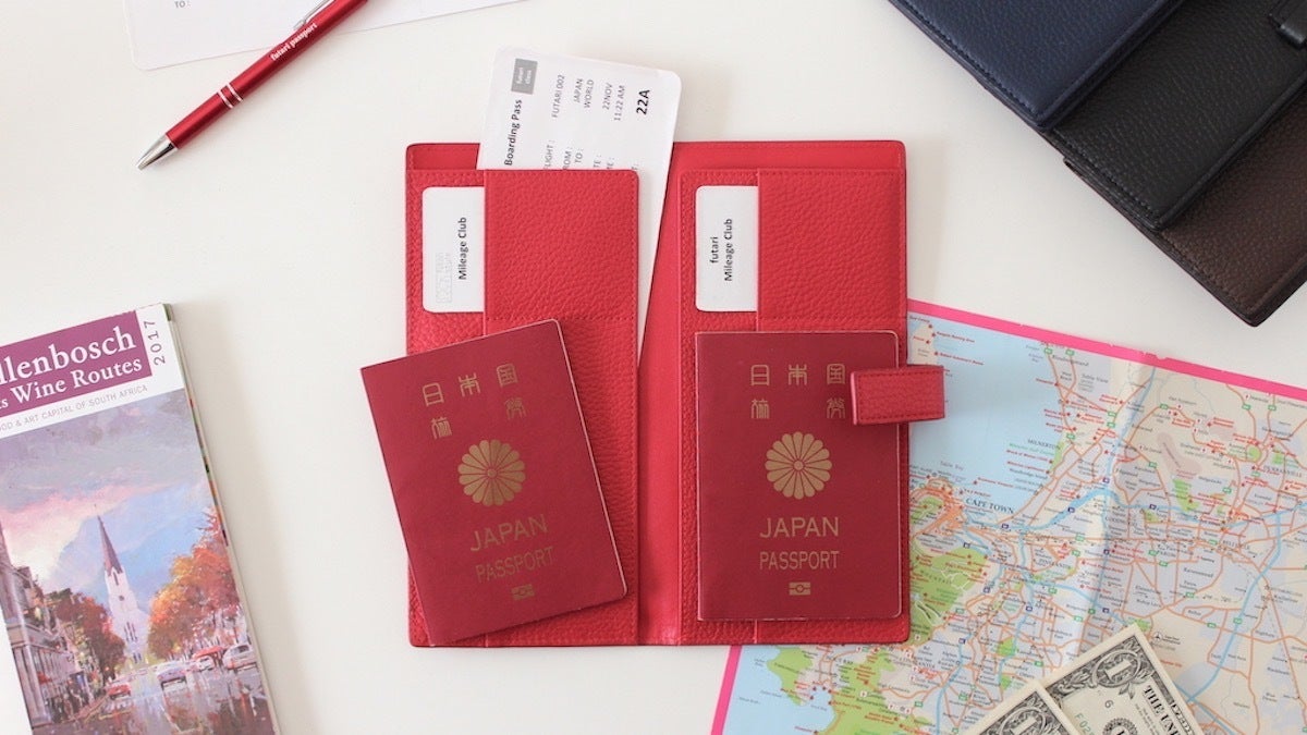 futari passportは、二人分のパスポート・搭乗券・カード類などあらゆる渡航書類一式をひとつにまとめて収納できます。