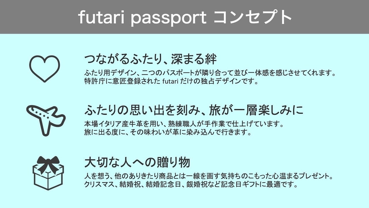 こんにちは。「ふたり」向けに特化し、”旅”や”食”などライフスタイル商品を作っているfutari styleと申します。今回ご紹介する「futari passport」は、大切なパートナーとの旅(人生)を、もっと楽しく、もっと幸せにする、つながる夫婦のパスポートケースです。