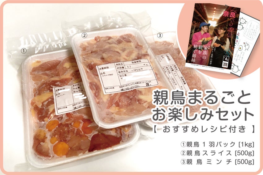 親鳥まるごとお楽しみセット!親鳥1羽パック、親鳥ミンチ、親鳥スライス、姉妹のストーリーが詰まった小冊子、お礼の手紙を冷凍でお届けします。