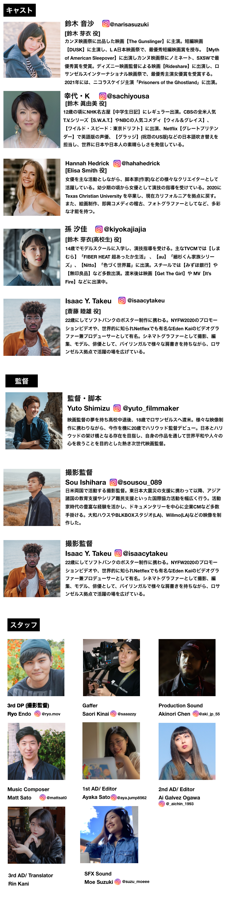 ハリウッド映画では日本人が活躍する場がアクター・制作陣共に数少ないため、僕はそういったアメリカで更に日本人の活躍の場を増やしたい、より日本人が世界で輝ける環境を作りたい、そんな思いで集まった同世代の20代がメインの映画制作チーム。