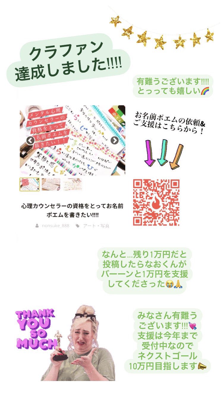 2020/12/19 10:02こんにちは。みなさんのご支援のおかげで達成することが出来ました!◎本当に有難うございました...!!まだ期間が今年いっぱいなのでネクストゴール10万円を目指していきます!12/25、1/3は おしゃべりバーにて1日店長お名前ポエムバーをするのでご都合よろしければ是非ともお越しください^_^ここがゴールではなく始まりで、来年は資格をとって更にパワーアップ出来る様に頑張りますーーー!!みなさま、身体にはお気をつけてクリスマス、年越し、楽しくお過ごしください* もっと見る