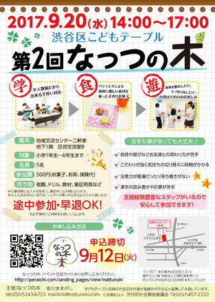 2017/08/23 19:07 主催者の牧さんからのメッセージ 8月18日に第1回目のなっつの木を開催いたしました。 初回にも関わらず4名のお子さんと、ボランティアスタッフ4名が参加しました。 みんな「はじめまして」なのでまずは自己紹介から。子ども達は緊張しながらもしっかり前をみて話してくれました。 今回は、高校生のボランティアスタッフも参加してくれました。フレッシュなお姉さん達に子ども達も大喜び!すぐに打ち解けていました。 学習タイムは30分×2コマで行いました。途中で休憩時間も取りましたが「休憩中もやるよ!」と子ども達はやる気に満ちあふれていて、スタッフの方がビックリ! 家庭では問題でつまずくと「もうやらない~」となってしまうお子さんも、学習をする環境が整っていたり、近くにスタッフがいると一緒に考えながら取り組めるので「やる気スイッチ」が入るようです。 学習を頑張った後は、みんなお待ちかねのおやつタイムです!白砂糖不使用の身体に優しいお菓子たち♪一番人気は写真手前のきなこボールでした。 お腹が満たされた後は、お楽しみタイム!この日は風船バレーとボール回しゲームを行いました。風船バレー用の風船を使ったので、普通の風船に比べ重さと弾力がありました。思っていた以上に思わぬ方向へ飛ぶことが多く、みんな夢中で風船を追いかけていました。 帰りの会では、ひとりひとり今日の感想を発表してもらいました。 ほとんどのお子さんが、「おやつと風船」と答える中、「学習!」と答えるお子さんもいて、笑いが絶えない時間となりました。 次回は9月20日に開催を予定しております。「次のレクリエーションは何をやろうかなぁ」と毎日わくわくしながら考えています。 なっつの木は参加されるお子さん達みんなが主役です!ぜひわくわくしながら遊びに来てくださいね。 なっつの木の申し込みはこちらから https://peraichi.com/landing_pages/view/nattunoki ※こどもテーブルの活動団体については、下記のホームページからでもご覧になれます http://shibuyaku-kodomo-table.jp/ もっと見る