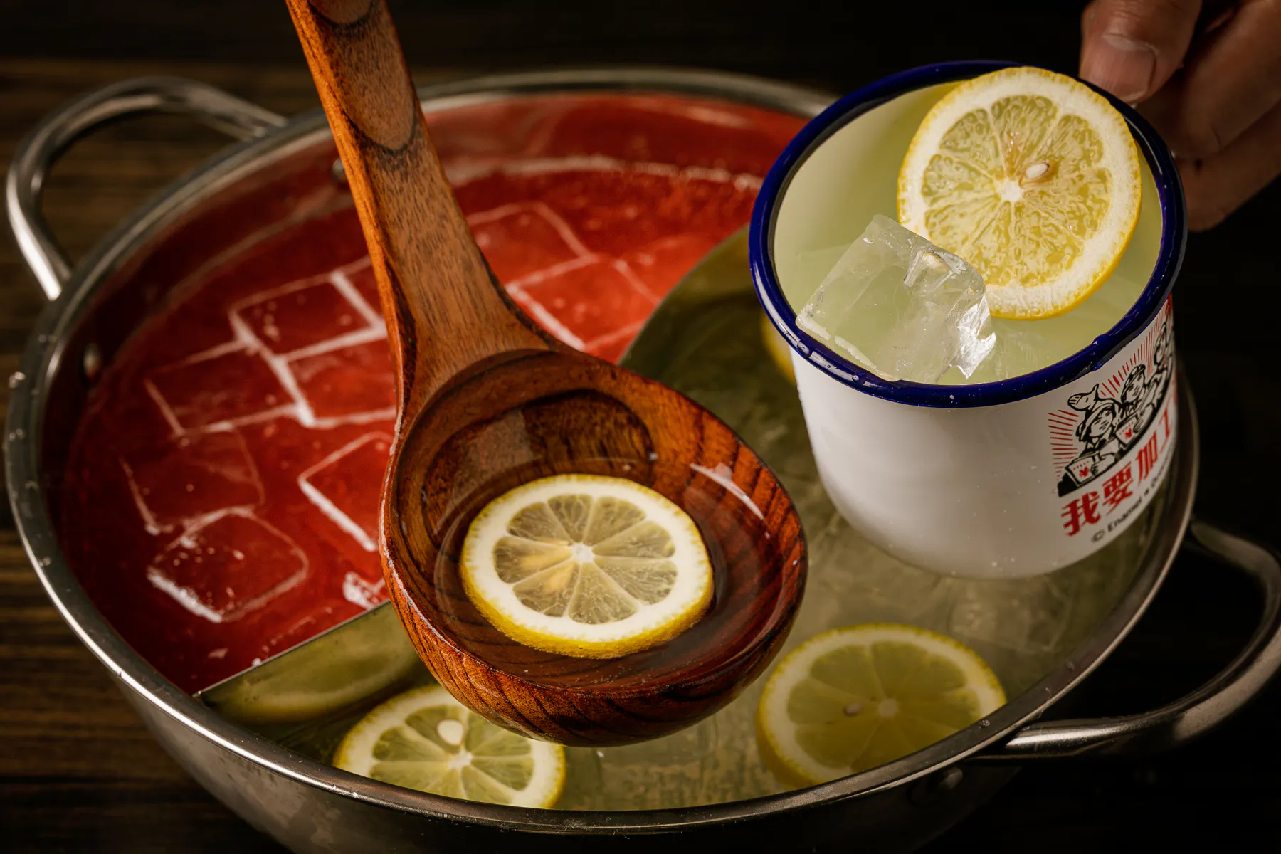 当店ではこの独特の鍋を器として使い、なかに二種類のお酒を入れて、お客様ご自身でサワーを作っていただける「火鍋サワー」をご用意しました。