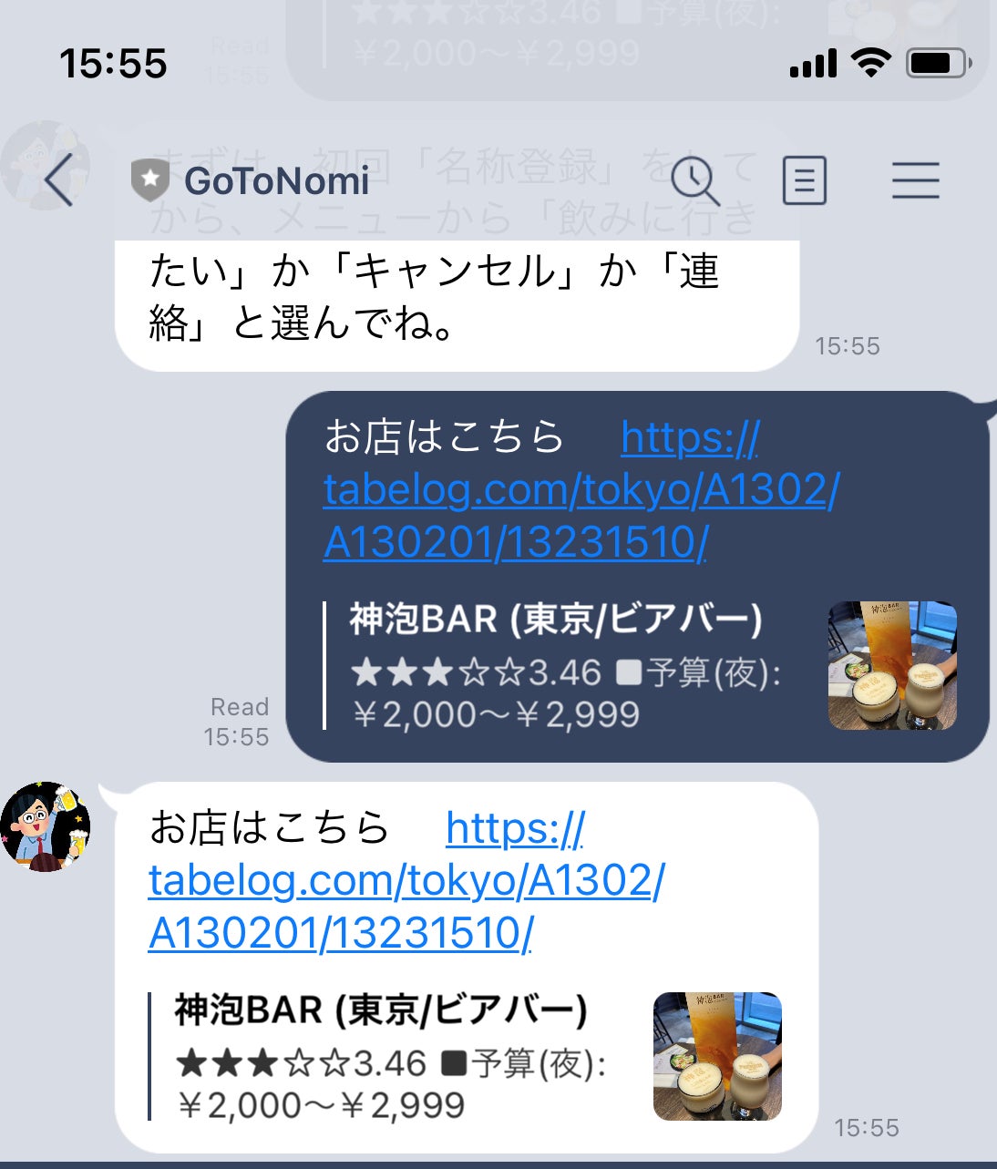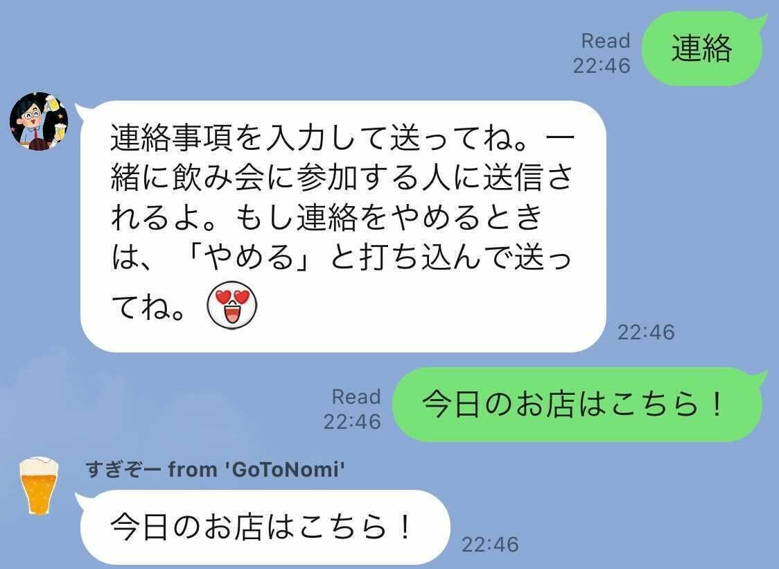 続けて「今日のお店はこちらです(URL)」と投稿すると、飲み会参加者にメッセージがくる。