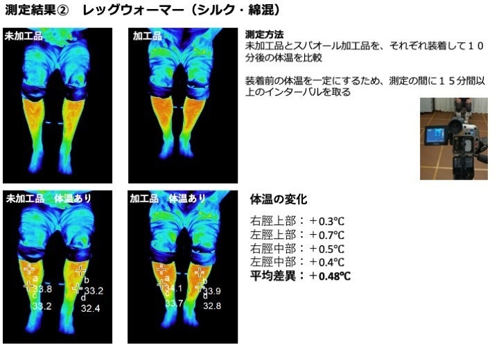 いずれの測定でもスパオール装着により体温が上昇することを確認しました。スパオールを加工する素材に関係なく、スパオール自体に血流促進効果があることが認められました。