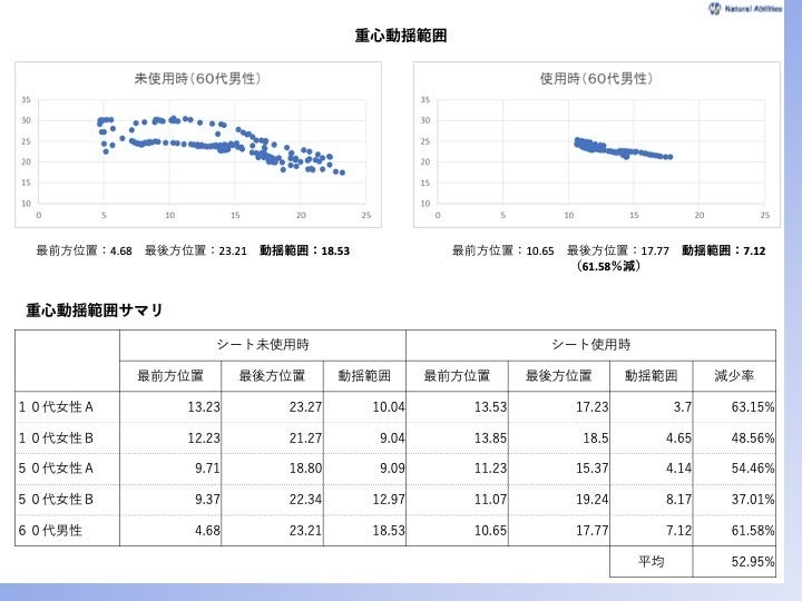 一見ただのシートなのですが、使ってみると確かにバランスが安定します。試しに押したり引いたりといったバランステストをしてみると、驚くほど安定しているのが実感できます。万一の際の転倒リスクが軽減していることは間違いないですね。重心が安定するので歩行も楽になりますし、疲労感も少なくなると思います。特に高齢者や妊婦など、運動量が少なくなりがちな方にお使いいただき、適度な運動を続けていただけたらと思います。