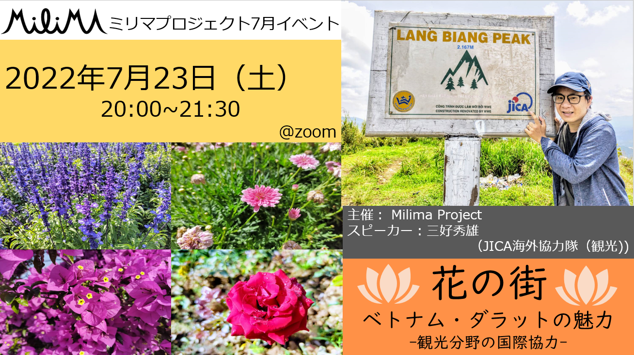 2022/06/21 07:00ミリマプロジェクト7月のオンラインイベントでは現在ベトナムでJICA海外協力隊として観光分野で活動をされている三好秀雄さんとの通信を行います。開催日: 2022年7月23日(土)20:00~21:30(申込締切 2022年7月21日(木))開催方法: Zoom参加費:無料・ベトナムで働くようになった経緯・JICA海外協力隊としての活動内容・派遣中の気づき等を語っていただく他、イベントの最後には三好さんの任地である「花の街ダラット」の魅力についてのプレゼンもあります。この機会にぜひ海外旅行の気分を味わってみてください!詳細は次のイベントページをご覧くださいhttps://fb.me/e/3sAtEPRtS◆申込方法参加をご希望の方は次のURLをクリック頂き、参加のお手続きをお願いいたします。https://docs.google.com/forms/d/e/1FAIpQLScblz8nMfF4SXAM9g4y3mEKL4Ly1vhSs1hBELup3Yme8GbAbg/viewformまた、次のURLより三好さんが協力隊活動の一環として更新されているダラットに関するブログをご覧いただけます!https://vn-kankou.com/今回がキャンプファイヤーを通じての最後のお知らせになります。これまでご覧くださりありがとうございました。今後はSNS等を中心に広報活動をしていきますので、フォローがまだの方は是非以下のアカウントをチェックしてみてください。△▲ △▲ △▲ △▲ △▲ △▲ △▲ △▲ △▲Facebookhttps://www.facebook.com/milimaproject/Instagramhttps://www.instagram.com/milima_project_kurobe/?utm_source=qrTwitterhttps://twitter.com/MilimaProject△▲△▲△▲△▲△▲△▲△▲△▲△▲△▲ もっと見る