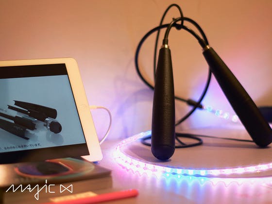 MagicLoopはスマートトイとして生まれ変わったなわとびです。ロープに内蔵されたLEDの光が、跳ぶ速さや跳び方によってインタラクティブに変化します。光の軌跡は残像となって様々な模様を描き出し、点滅のパターンによっては空中に絵を描くような光り方にすることもできます。それらの設定はスマートフォンを使って簡単に変えることが可能です。
