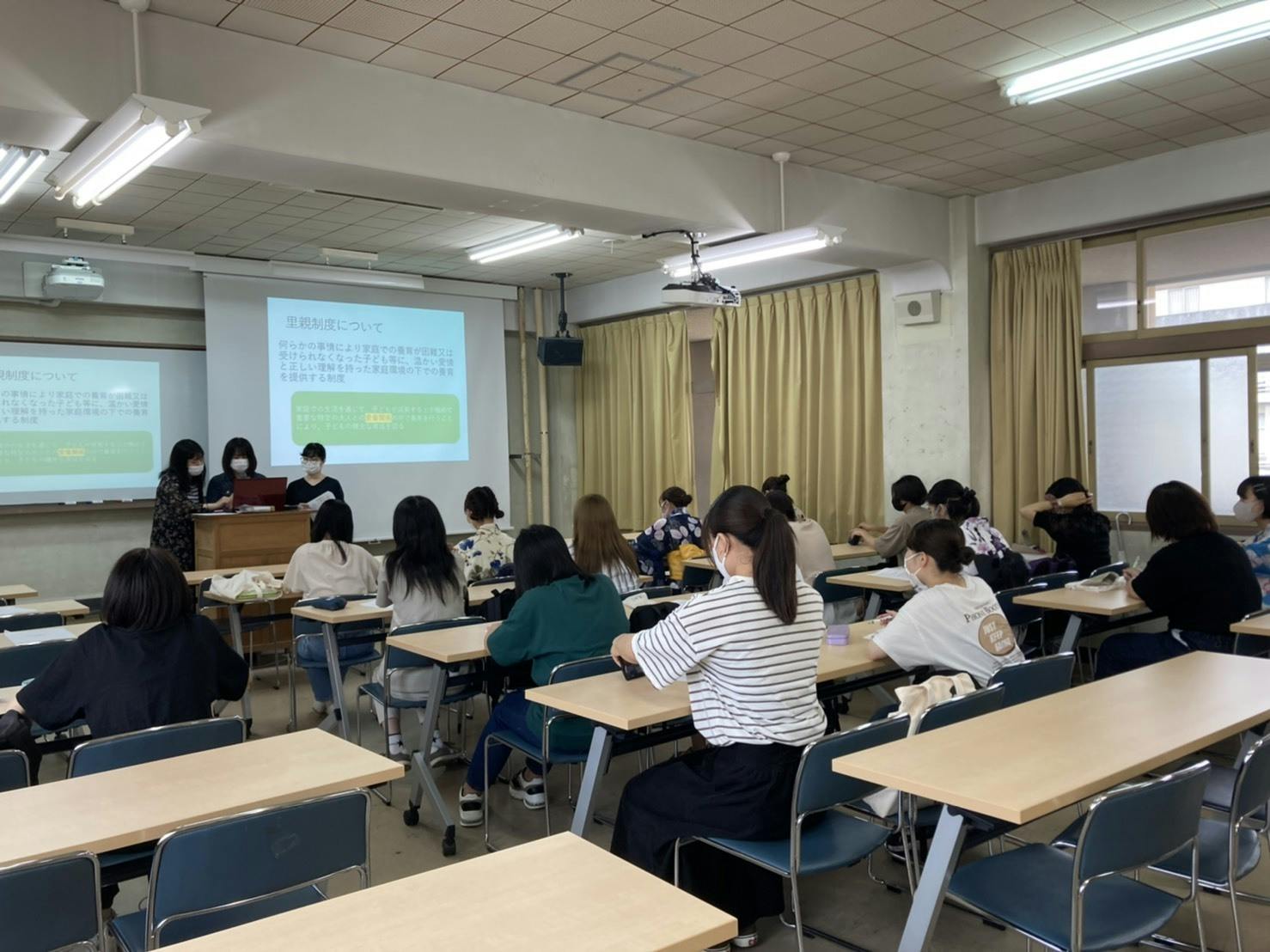 2014年より、『美作大学里親・里子支援サークル』を発足させ、美作地区里親会と連携を図り、美作地区の里親・里子さんを支援するとともに、里親制度の理解促進を図るため、チラシの作成・託児のサポートなど里親会と協力してきました。現在、このサークルは3年生11人、2年生14人、1年生18人と顧問の先生で活動に取り組んでいます。