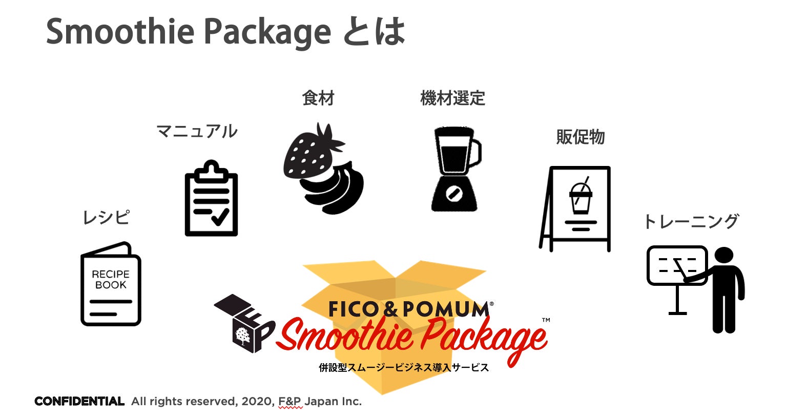 『併設型スムージー販売ビジネス導入支援サービス「Smoothie Package」』とは、スムージーを販売するために必要な「レシピ」「マニュアル」「食材」「機材」「販促物」「オペレーショントレーニング」などが全て揃った導入支援サービスパッケージです。