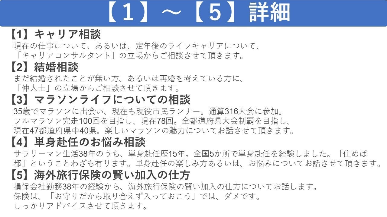 現在は50代、60代の方が、重ねてきた経験、積み重ねてきたキャリア、身につけたスキル、知識を活かし、自律的にキャリアを開拓するための、おじさんLCC(ライフキャリアコミュニティ)の運営、おじさんによるおじさんのためのセミナーの開催等を行っています。