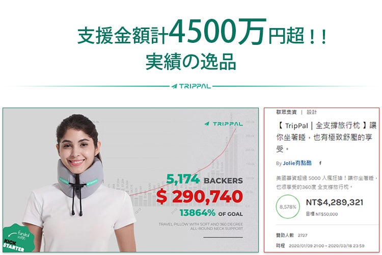 米国CF(クラウドファンディング)で支援金額3000万円超! 台湾では1500万円もの支援を集めたネックピロー「TripPal」がCAMPFIREに登場。先行して実施された国内のCFでも、達成率370%を超えた実績ある製品です。