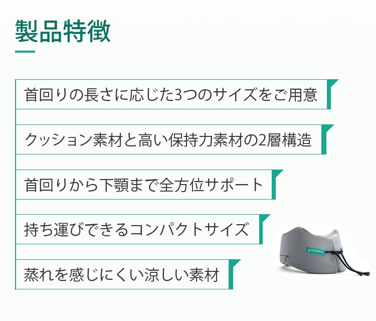 メモリーフォーム(形状記憶素材)で首の稼働に無理なく対応。内部に使用している固め素材が保持力を、外側の素材がクッション性をそれぞれ担っており、首元に巻いても圧迫感が少なく安定感を維持します。