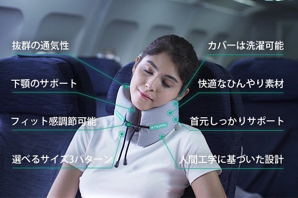 「TripPal」はクッションの心地よさをそのままに、頭をしっかりと支えるホールド感を実現しました。睡眠中がくん、と頭が落ちるような、思わぬ首の稼働を抑制。なのに、肩と首にすっぽりとフィットするので、まるで後ろからそっと誰かの腕に抱かれているような安心感があります。