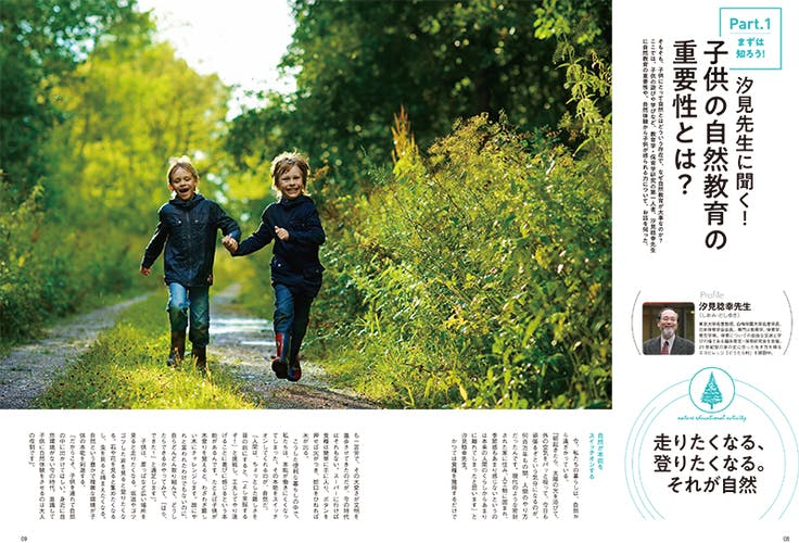 便利な暮らしが広がり、本能が働きにくくなった現代。広い原っぱや坂道、ゴツゴツとした岩など、豊かで複雑な自然は子供たちの本能を刺激します。東京大学名誉教授の汐見稔幸先生へのインタビューや、自然体験型農場「KURKKU FIELDS」のおすすめ情報を収録。