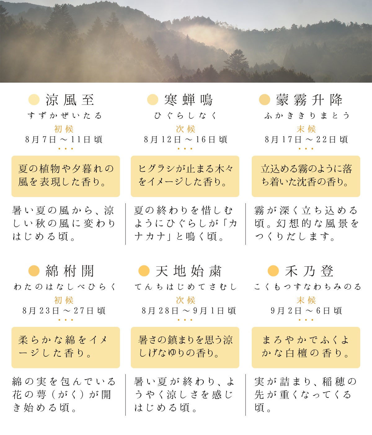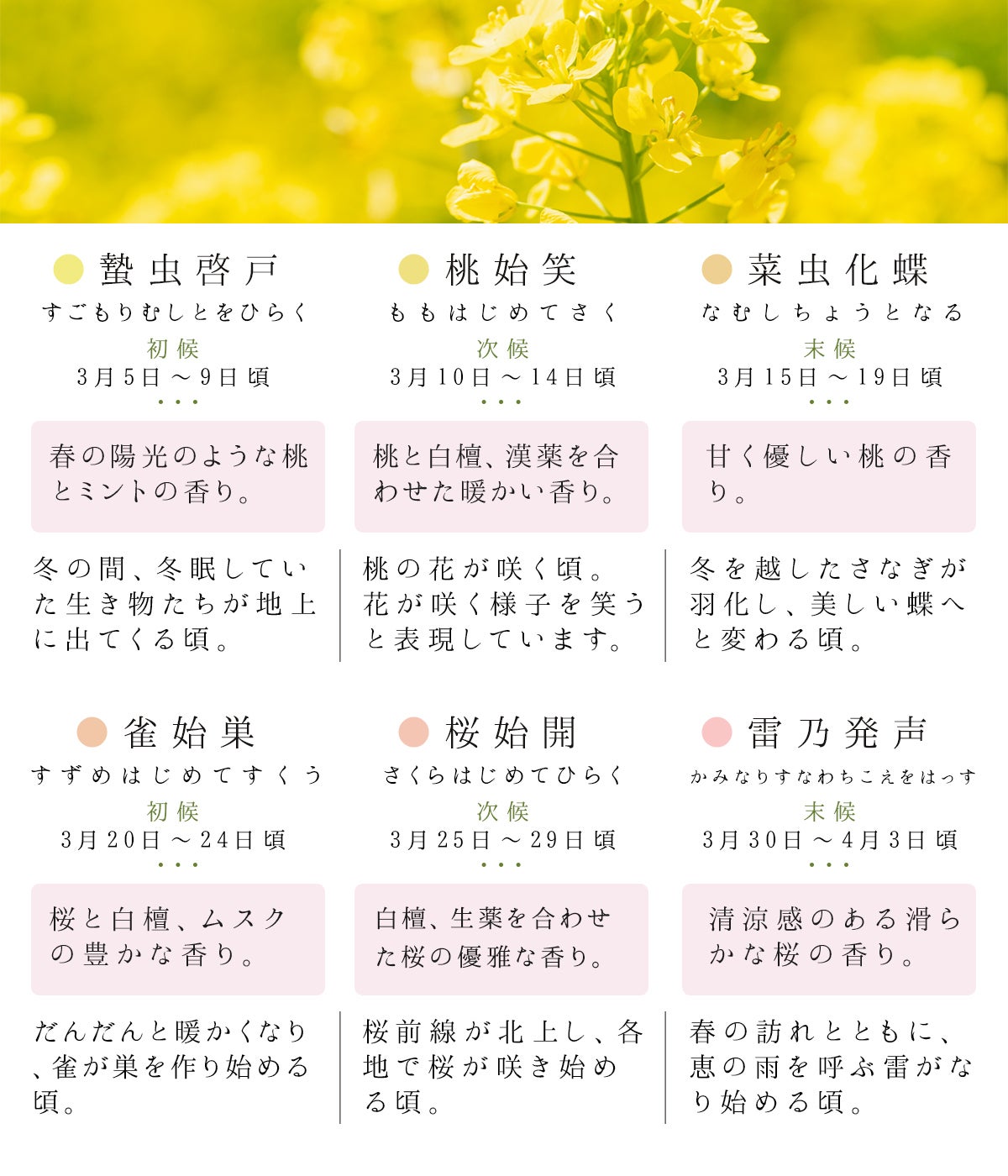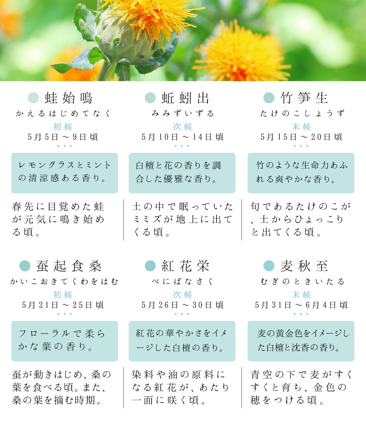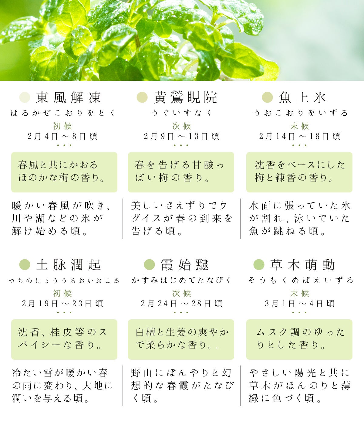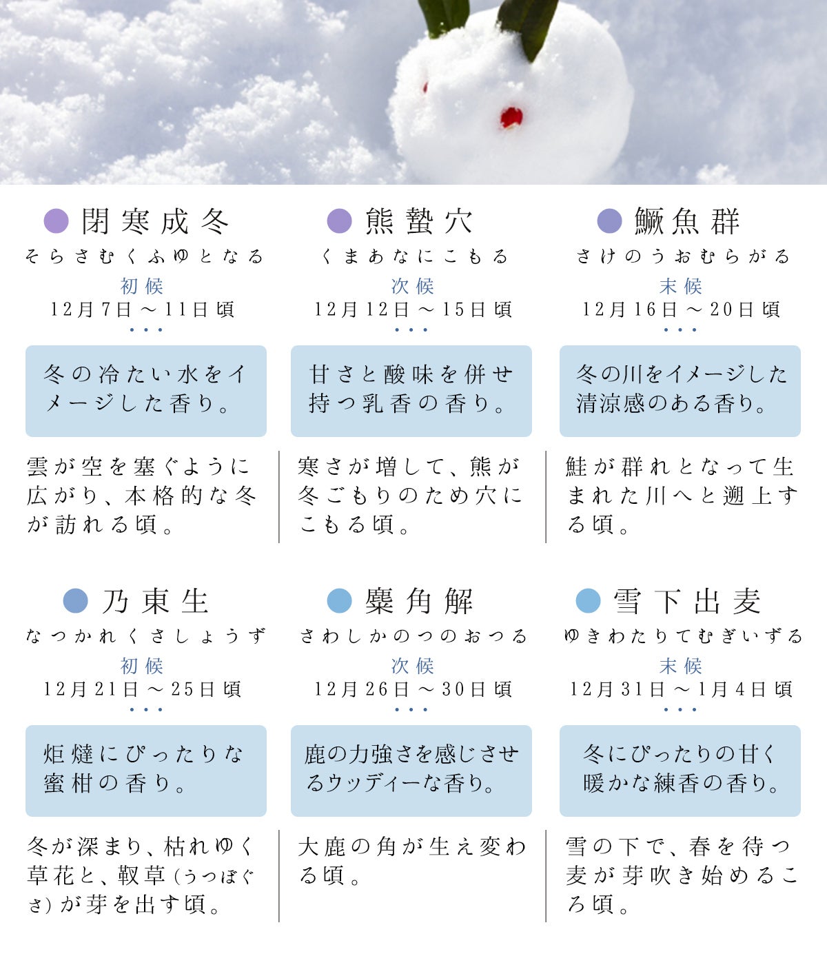 『七十二種香』の構成は『七十二候』に準じています。詳しい内容は本文下の『七十二候一覧』を参考にしてください。