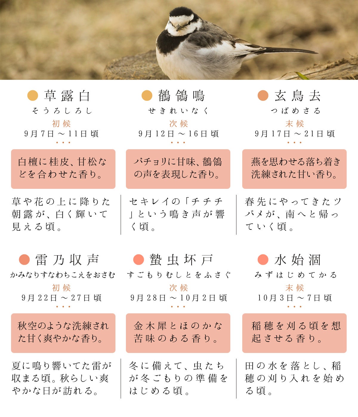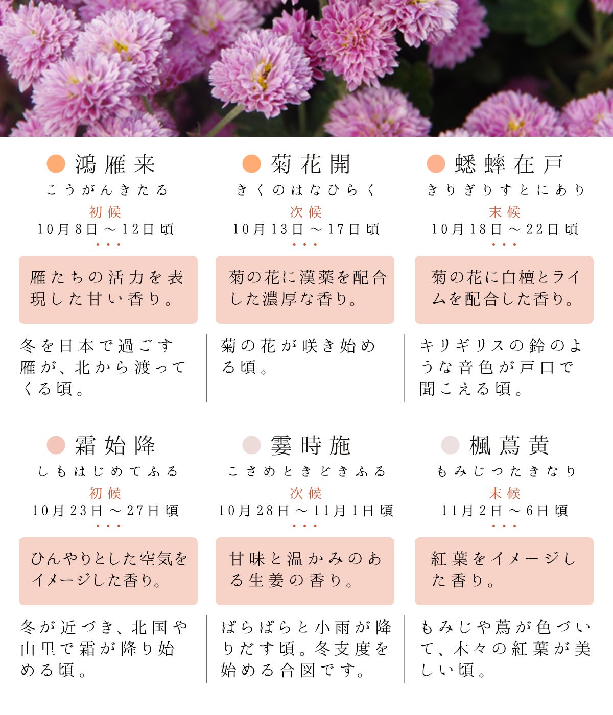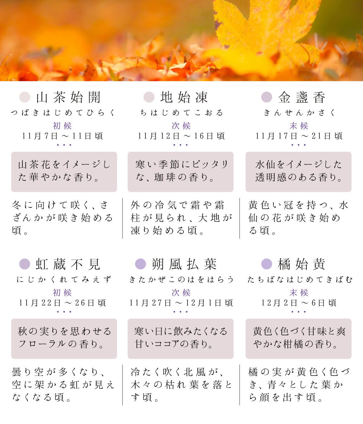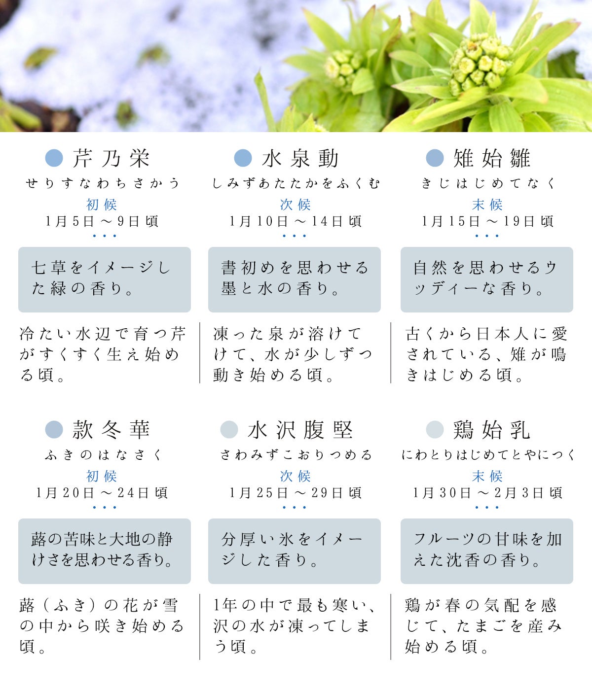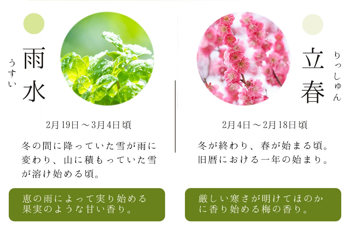 『七十二種香』の構成は『七十二候』に準じています。詳しい内容は本文下の『七十二候一覧』を参考にしてください。