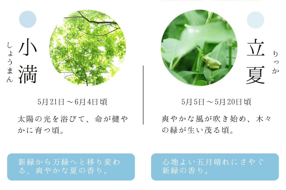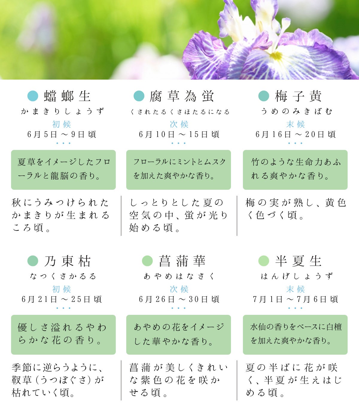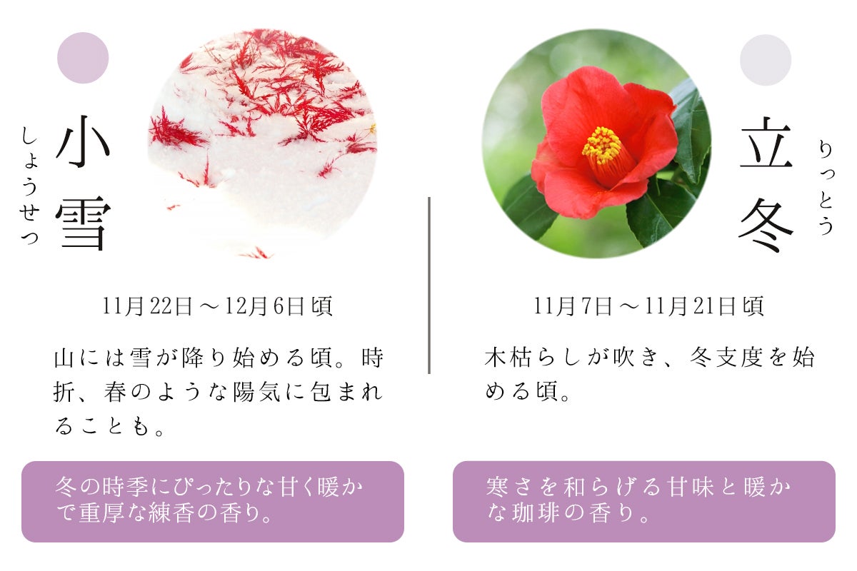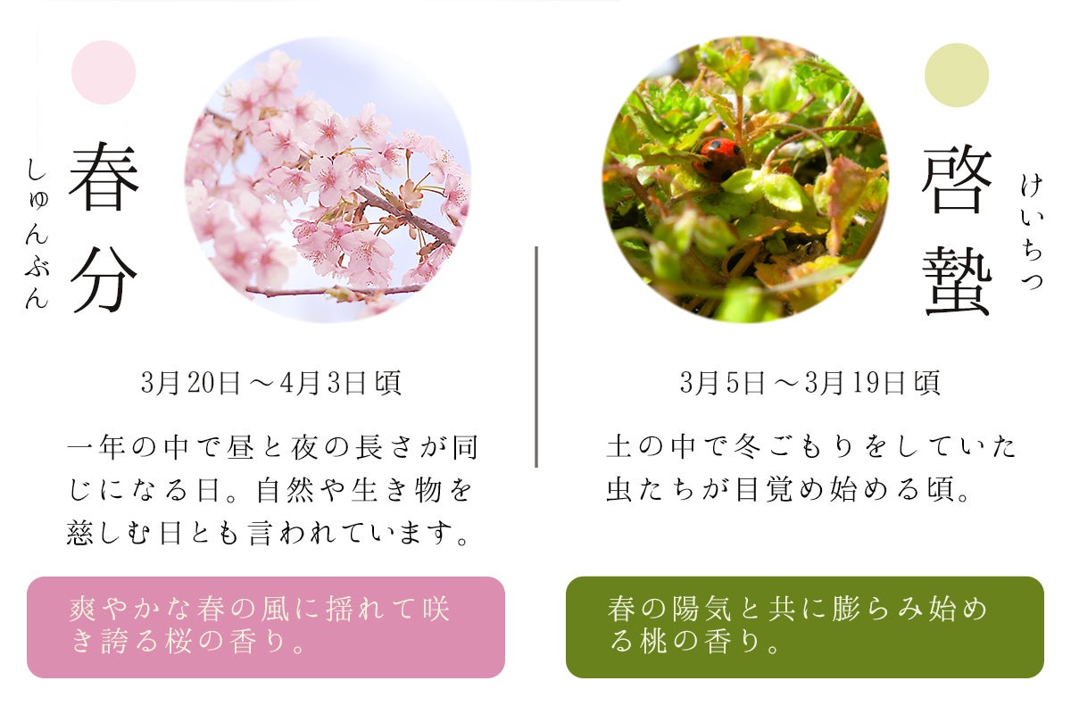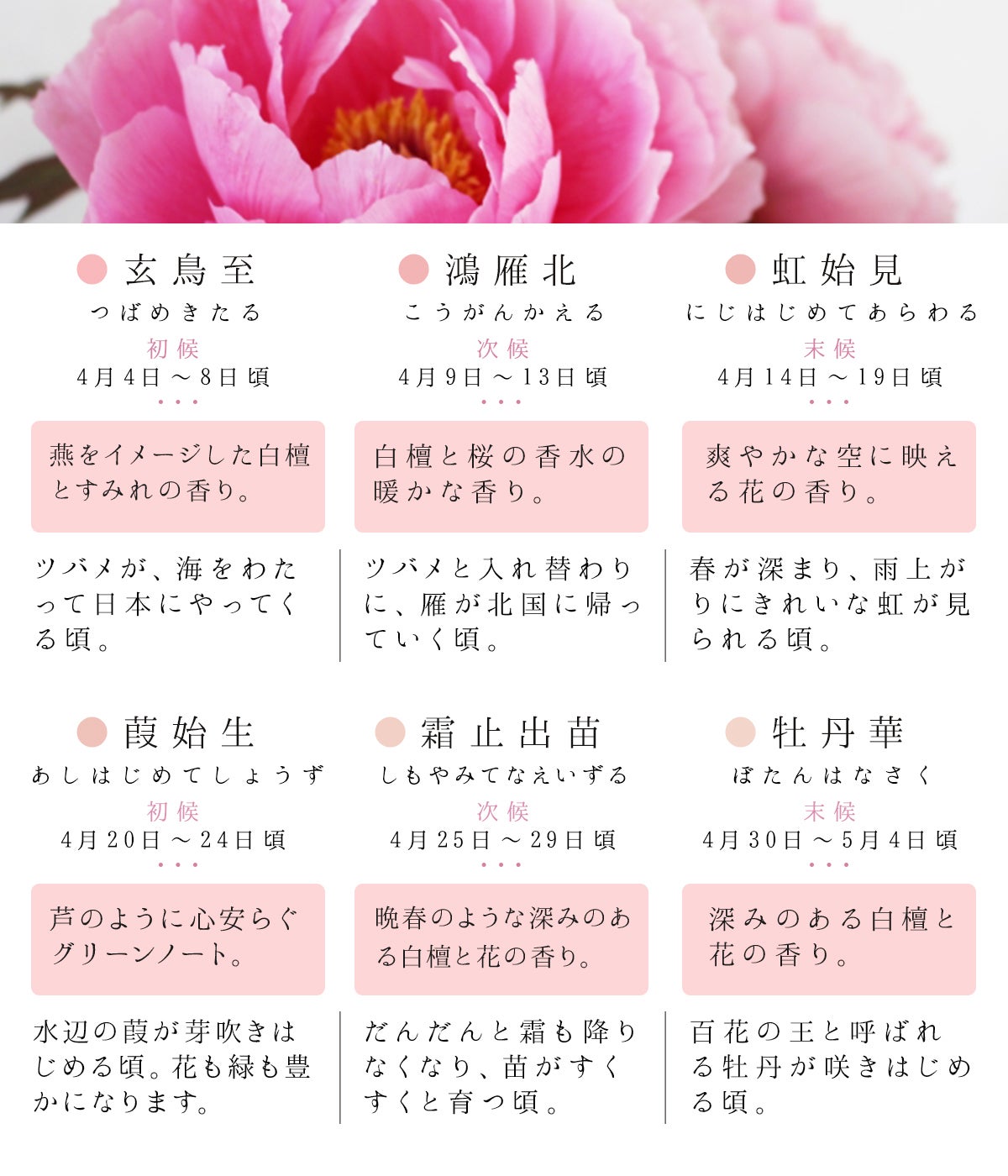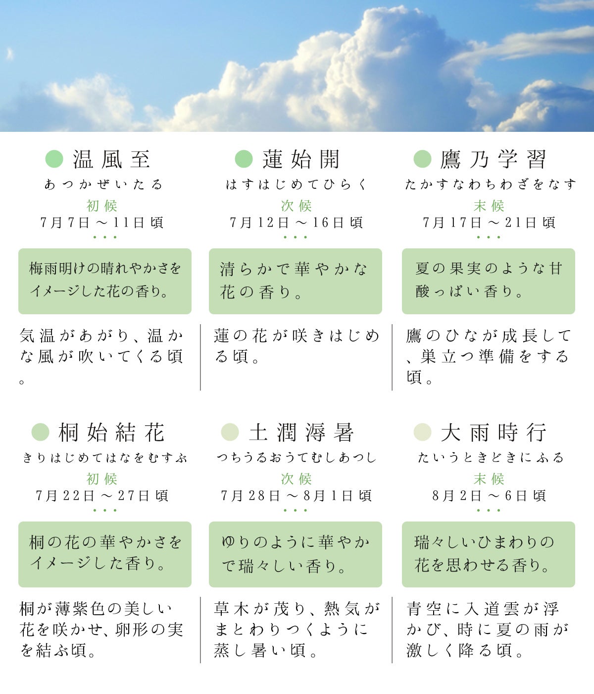『七十二種香』の構成は『七十二候』に準じています。詳しい内容は本文下の『七十二候一覧』を参考にしてください。