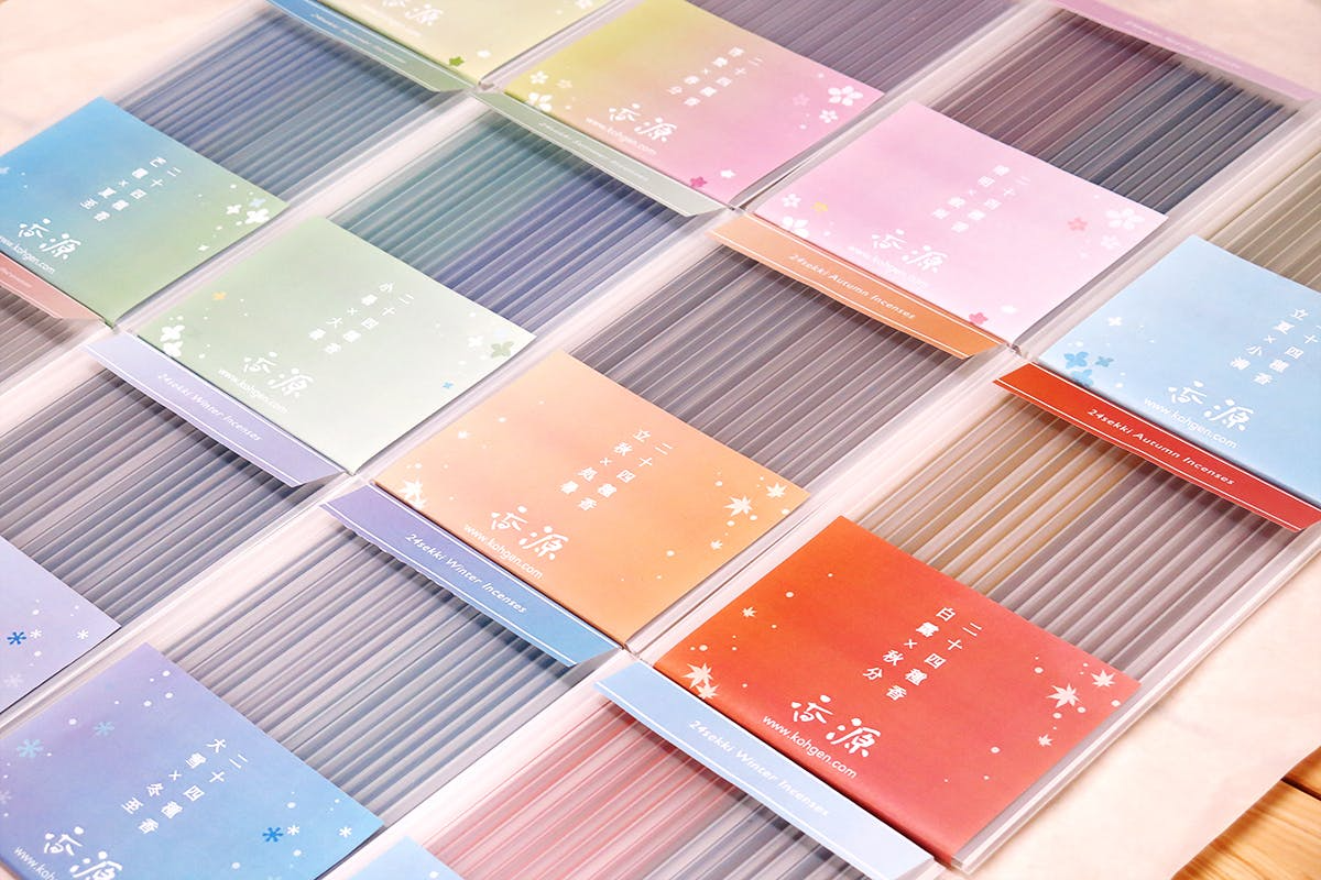 『二十四種香』は旧暦の一年を24等分にして約2週間単位の季節の細かな移り変わりを現した「二十四節気」を基に作成しました。1年で24種類のお香をお楽しみいただけます。