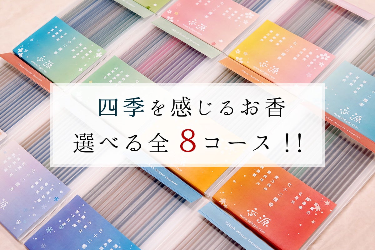 外に出かけたくても出られない人が増えていることも一因と言えるかもしれません。しかし、私たち日本人にとって四季は大切なものです。こんな状況下でも気軽に、そして家にいながら四季を香りで感じられるよう、我々香りのプロが季節に合ったお香を厳選し、今回の商品である「二十四種香」&「七十二種香」(全8コース)をご用意しました。