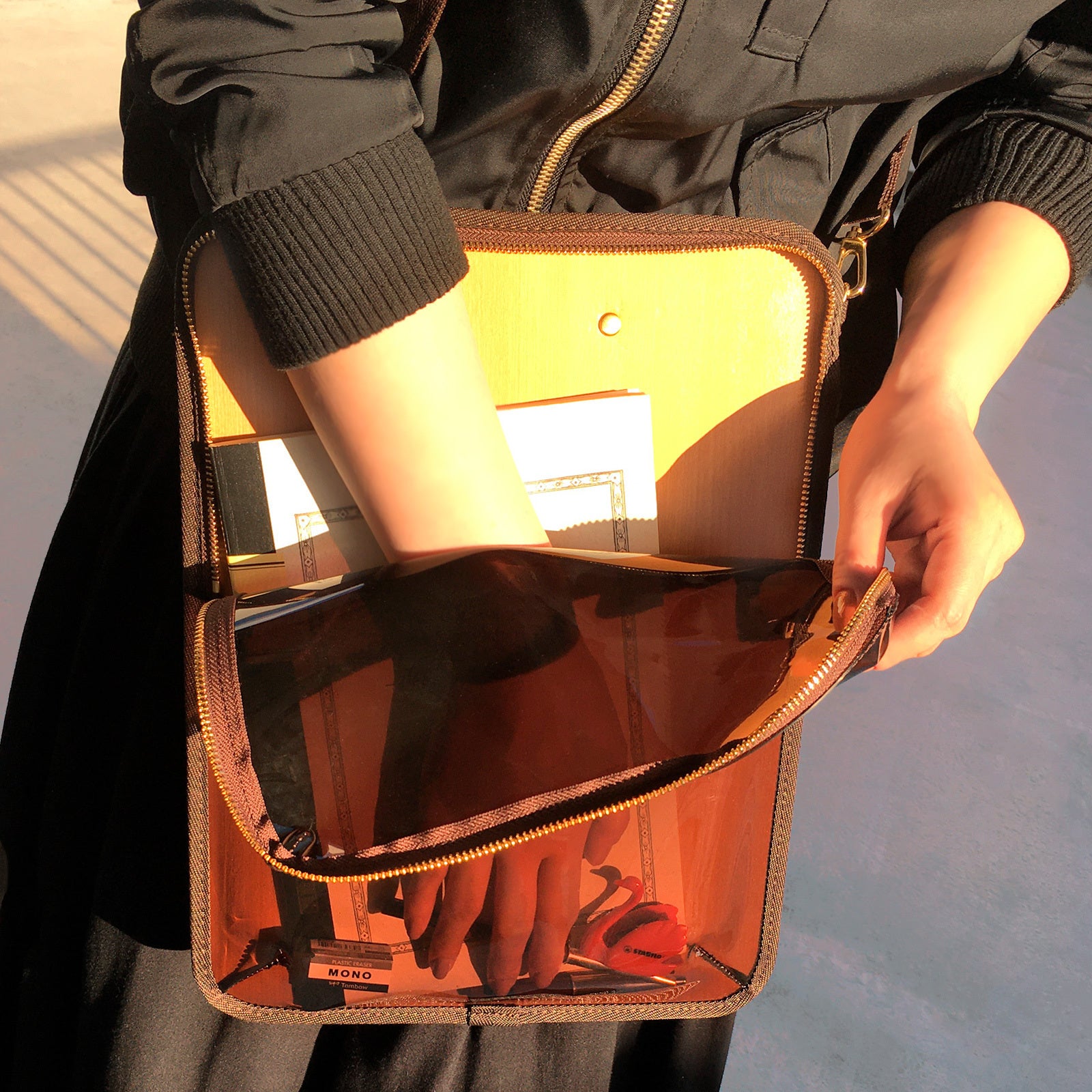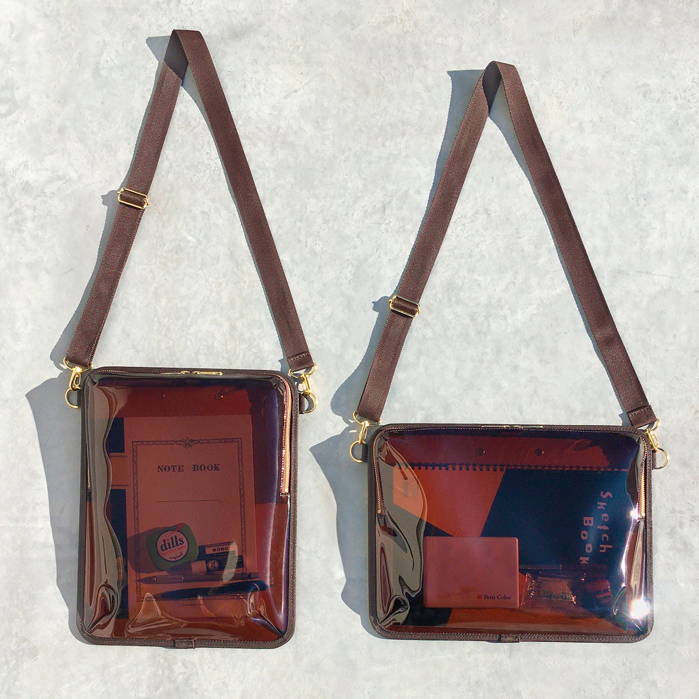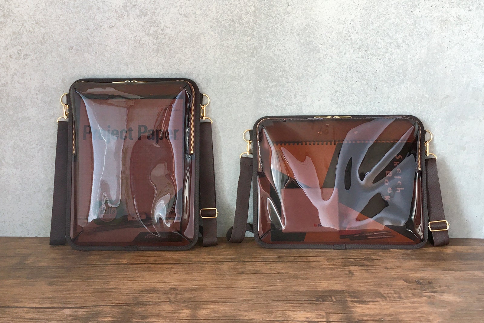 お気に入りの画材などをアピールした使い方もできますが、中身が見えすぎると普段使いがしにくいため、ほどよいスモーク感がある濃い目のブラウンをチョイスしました。