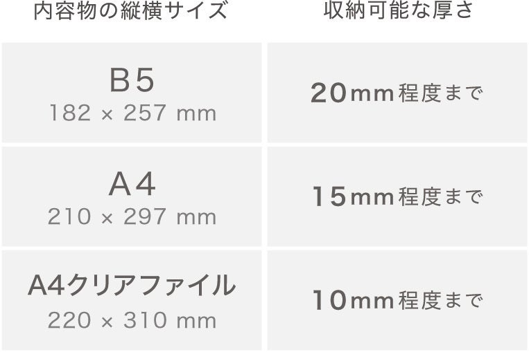 バッグの片面がボードでできているため、入れる物の縦横の寸法によって入る厚さが異なります。