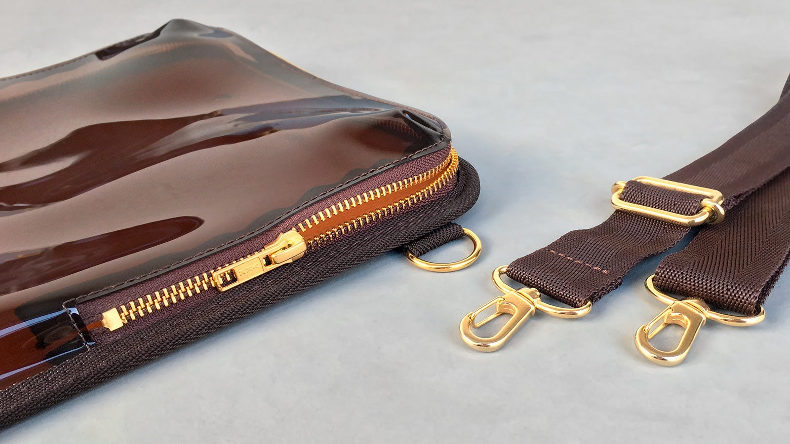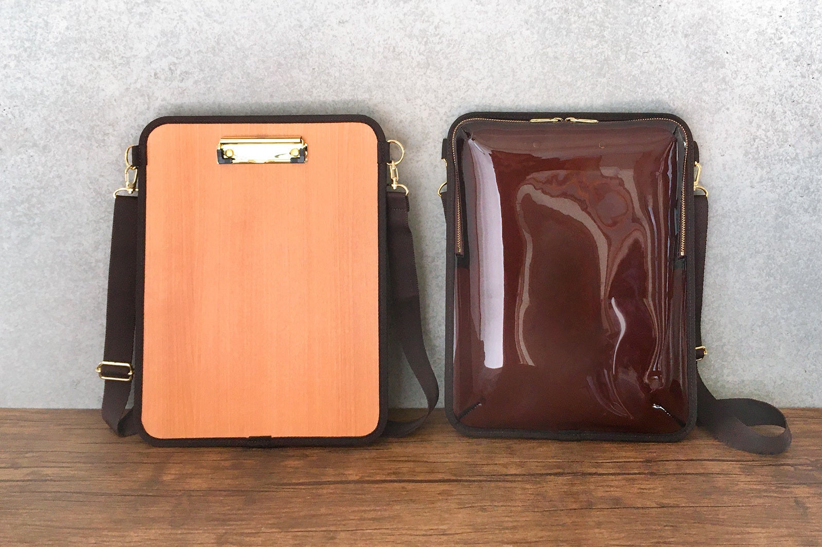 クリアブラウンのビニール素材と木目素材を組み合わせた、大人っぽいシックなアイテムです。