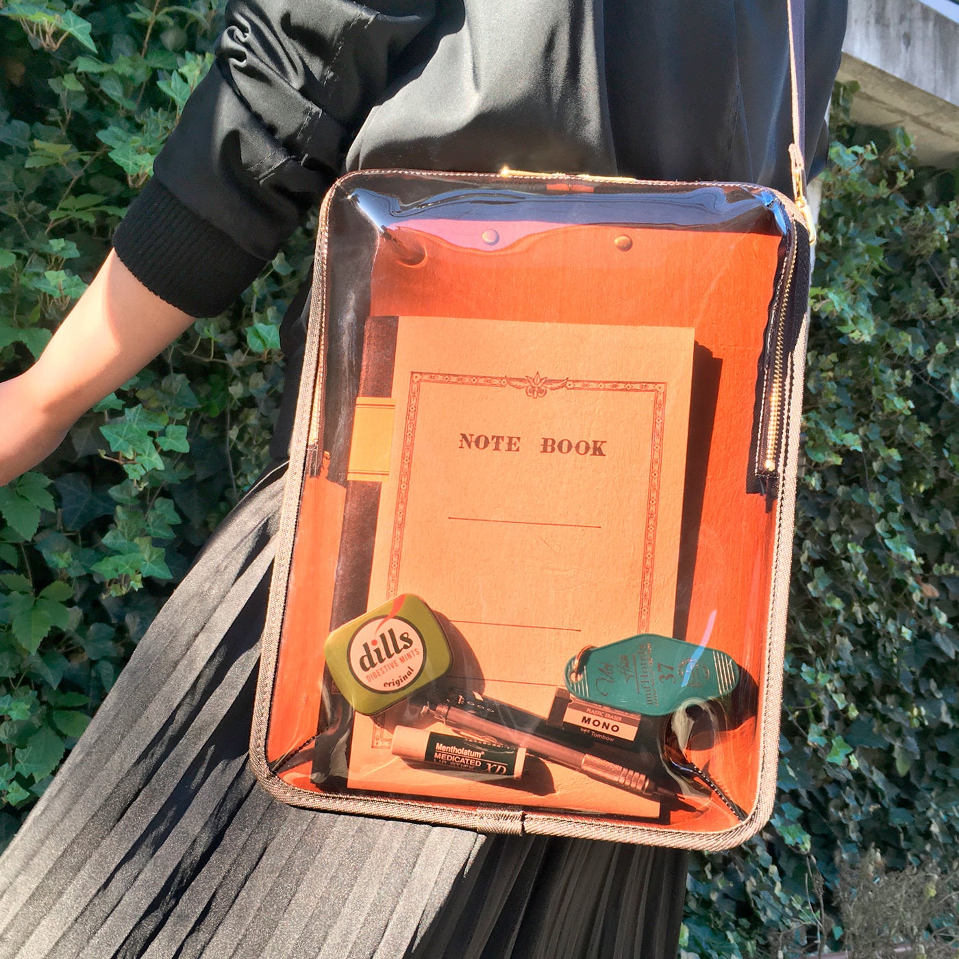 バッグ自体にしっかりとした大きさがありますが、クリア素材を使用しておりますので圧迫感が少なく、ファッションによく馴染みます。