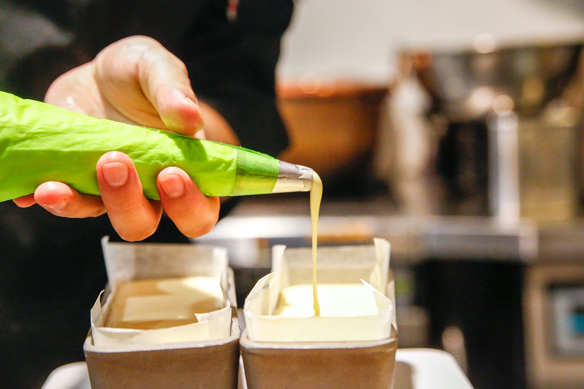 型の8分目までを水に浸けて焼くことで、大好評のとろける食感を生み出しています。