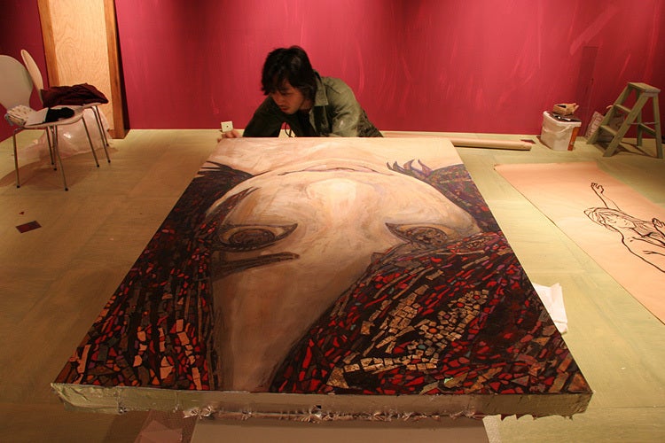 日本画とモザイクという、古典技法を基にしながら制作をつづけ、新しい表現を模索するアーティストとして意気投合し、『いつか日本で二人の展覧会を行おう!』と約束しました。