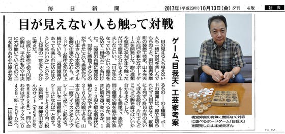 2017/10/13 19:41支援者の皆様 目我天の紹介記事が今日の毎日新聞夕刊の社会面の載りました。嬉しいです。 紙面画像が手に入ったので添付します。 デジタル版のページを見つけました。 こちらのページで確認できます。 https://mainichi.jp/articles/20171013/k00/00e/040/163000c 現在ゲーム作りに邁進しています。手作りなので思った以上に時間がかかっています。10月末には発送できると思いますので、もう少しお待ちください。 それではよろしくお願いします。 山本 もっと見る