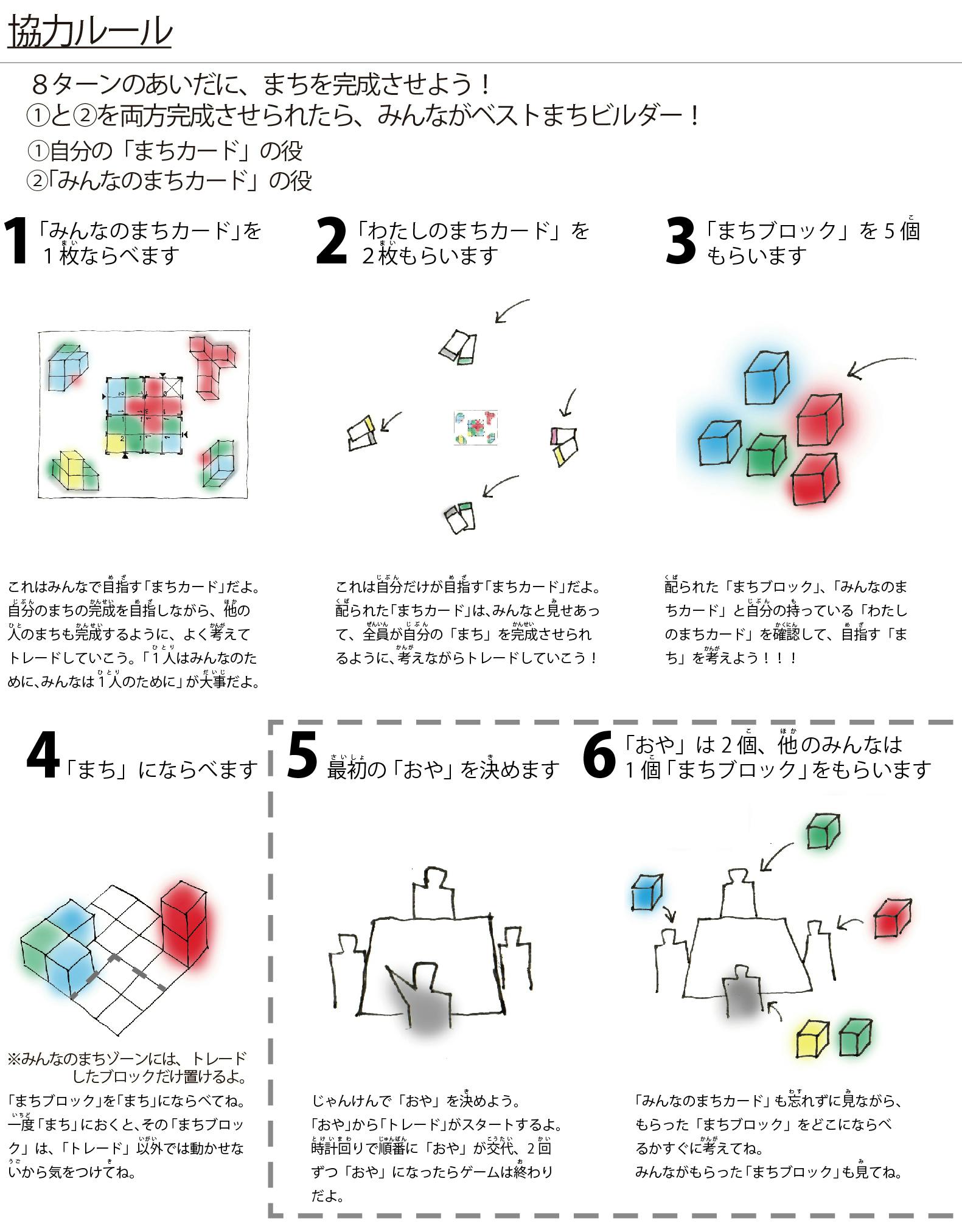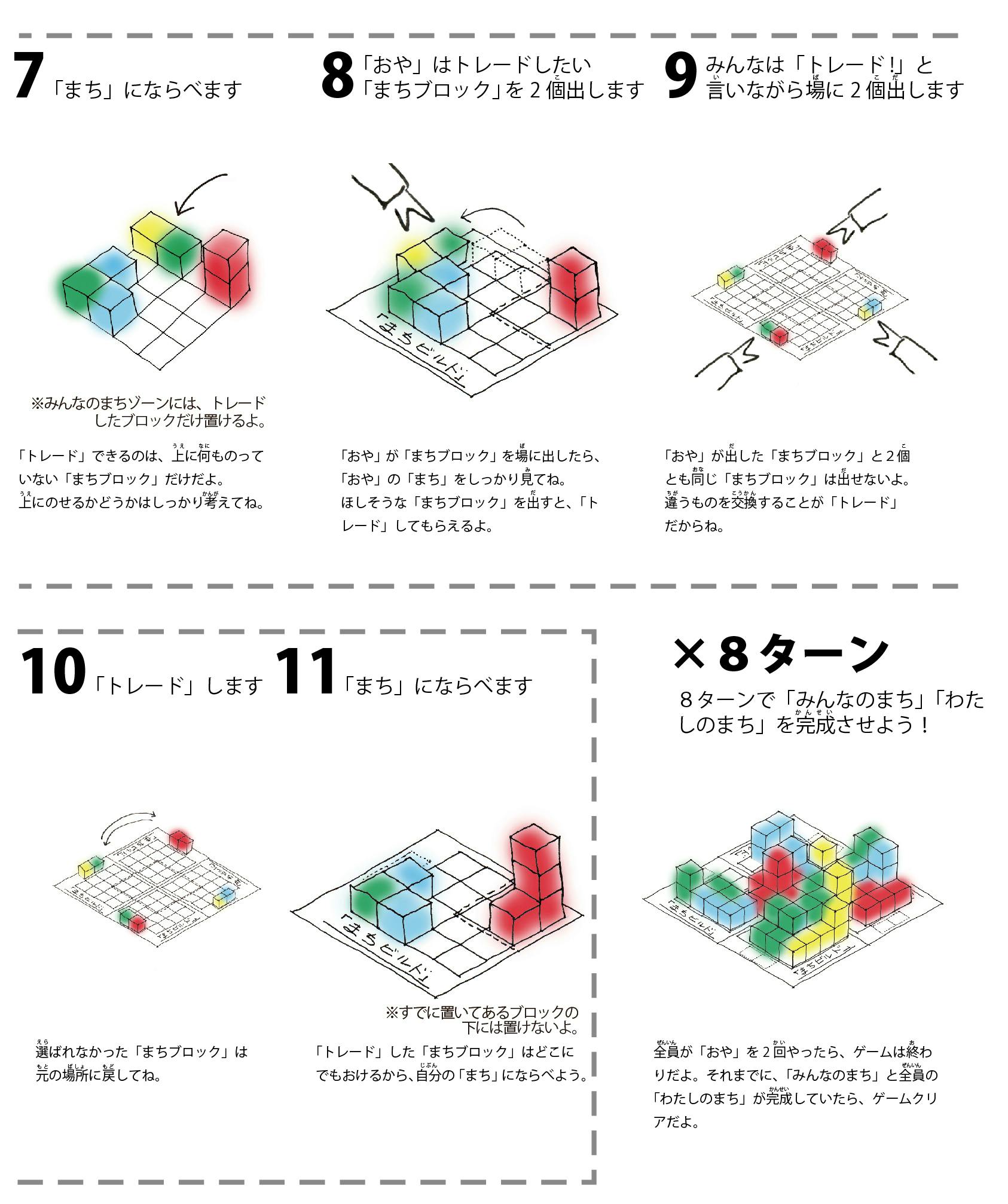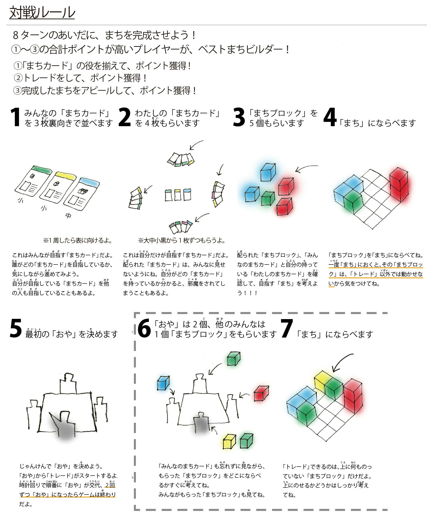 プレイヤー同士が競い合いながら「わたしの理想のまち」を育てる遊び方(①対戦ルール)と、プレイヤーで協力して「みんなの理想のまち」を育てる遊び方(②協力ルール)両方が楽しめるゲームとなっています。いずれの遊び方も、プレイヤー同士が互いにwin-winになるようなトレードを進めていくことが、理想のまちをつくるうえでのポイントとなります。