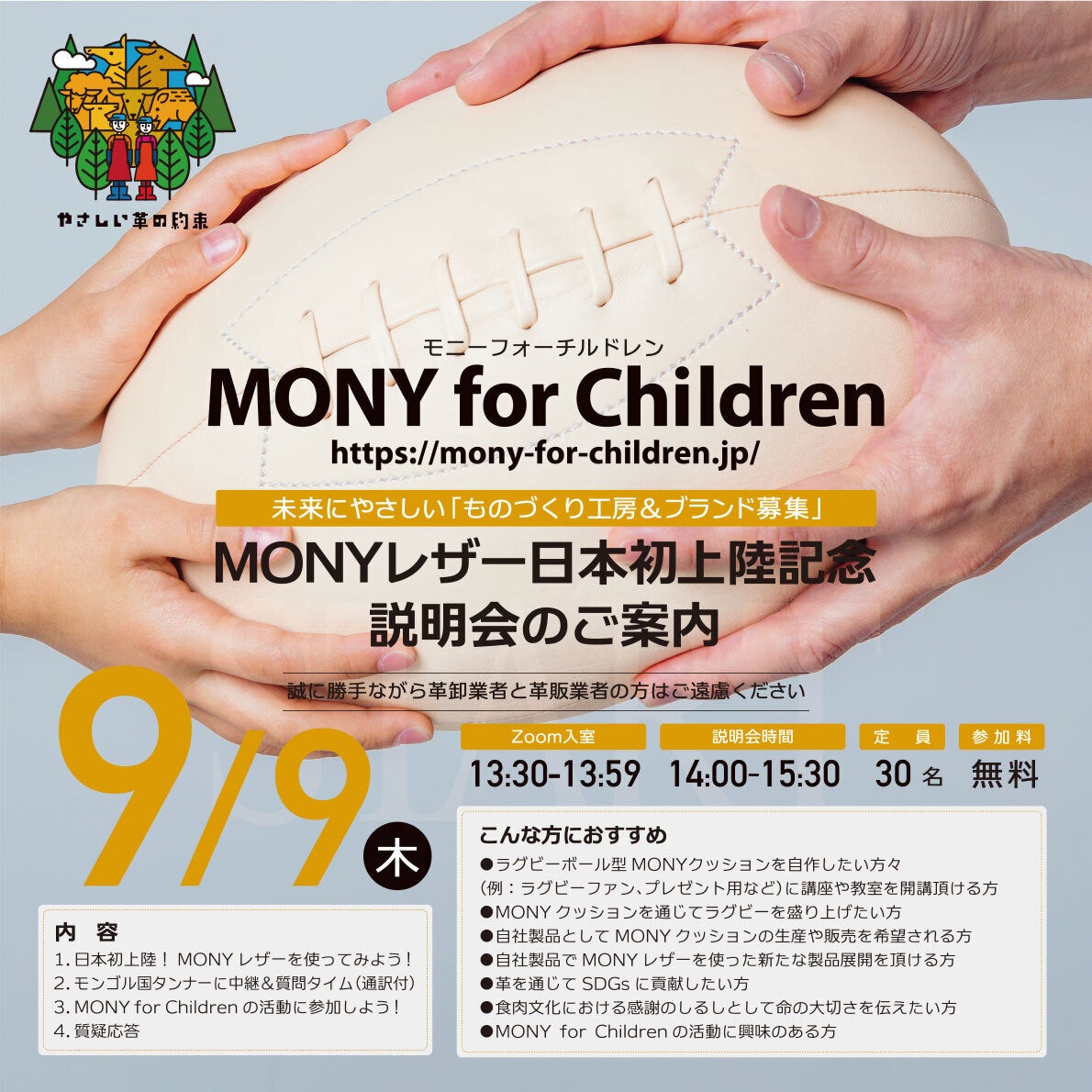 2021/08/23 16:40今年1月に実施した「モンゴルから日本へ想いをつなぐ!やさしい革のある暮らし」クラウドファンディングでは、大変お世話になりました。相変わらずコロナ感染拡大や各地での大雨被害が続いておりますが、被害に遭われた方々の1日も早いご回復や復旧を心からお祈り申し上げます。この度、クラウドファンディングでご支援いただいた株式会社久保柳商店様の主催で、MONYレザー日本初上陸記念説明会を開催することになりました。クラウドファンディング終了後、皆様からご支援いただいた想いをこれからも活かし、持続可能な地球を次世代の子ども達につなぐために、5月5日にMONY for Childrenを立ち上げ、MONYレザー日本上陸のための準備をしてまいりました。https://mony-for-children.jp/この説明会をきっかけに、SDG12(持続可能な開発目標)「つくる責任、つかう責任」の貢献から目指し、持続可能な地球を次世代の子供たちにつなぐために、レザー業界に関わる皆様のお力をお借りして、一緒に創り上げ、伝え、広げていきたいと思っています。よろしくお願いいたします。開催日時/9月9日木曜日ZOOM入室/13:30~時間/14:00~15:30場所/ZOOM参加費/無料主催/株式会社久保柳商店協力/モンゴル国駐日大使館、一般社団法人やさしい革チラシはこちらからご覧いただけます。●レザー業界が抱えている問題を解決するきっかけにしたい方●MONYレザーを通じて動物の命の大切さを伝えることにより、SDGsの達成に貢献したい方●モンゴルの方の想いを直接聞いてみたい方●エシカル商品に興味のある方などお気軽にお越しください。皆様からのお申込みを心からお待ちしております。お申し込みはこちらから もっと見る
